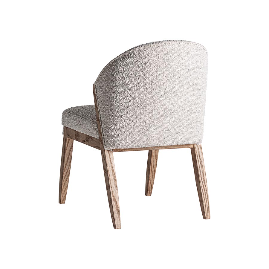Silla Prati bouclé de estilo contemporáneo fabricado en madera de pino en color marrón combinado con algodón bouclé en color blanco.