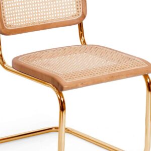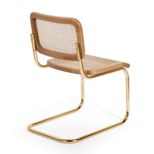 Silla con patas de tubo de acero dorado. Forma curvada que aporta a la silla cierta flexibilidad y balanceo. Con respaldo y asiento en madera de olmo y ratán natural.