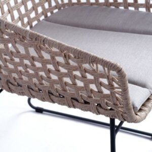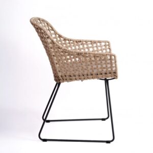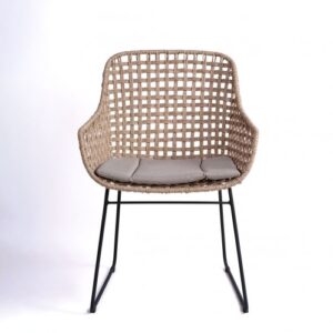 Sillón de comedor para exterior con asiento de ratán sintético y pata de metal color gris. Cuenta con cojín tapizado en color gris lino. Combinalo con nuestras mesas y sillas en estos mismos tonos neutros para conseguir un ambiente acogedor en tu terraza o porche.