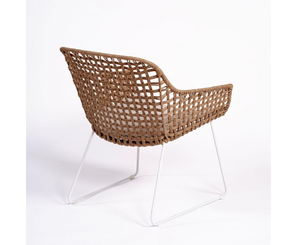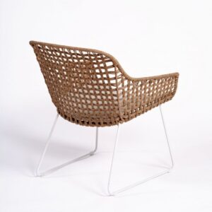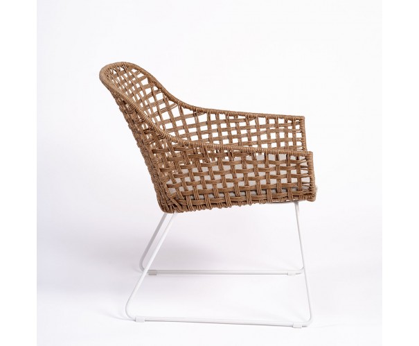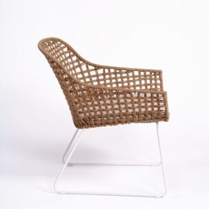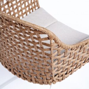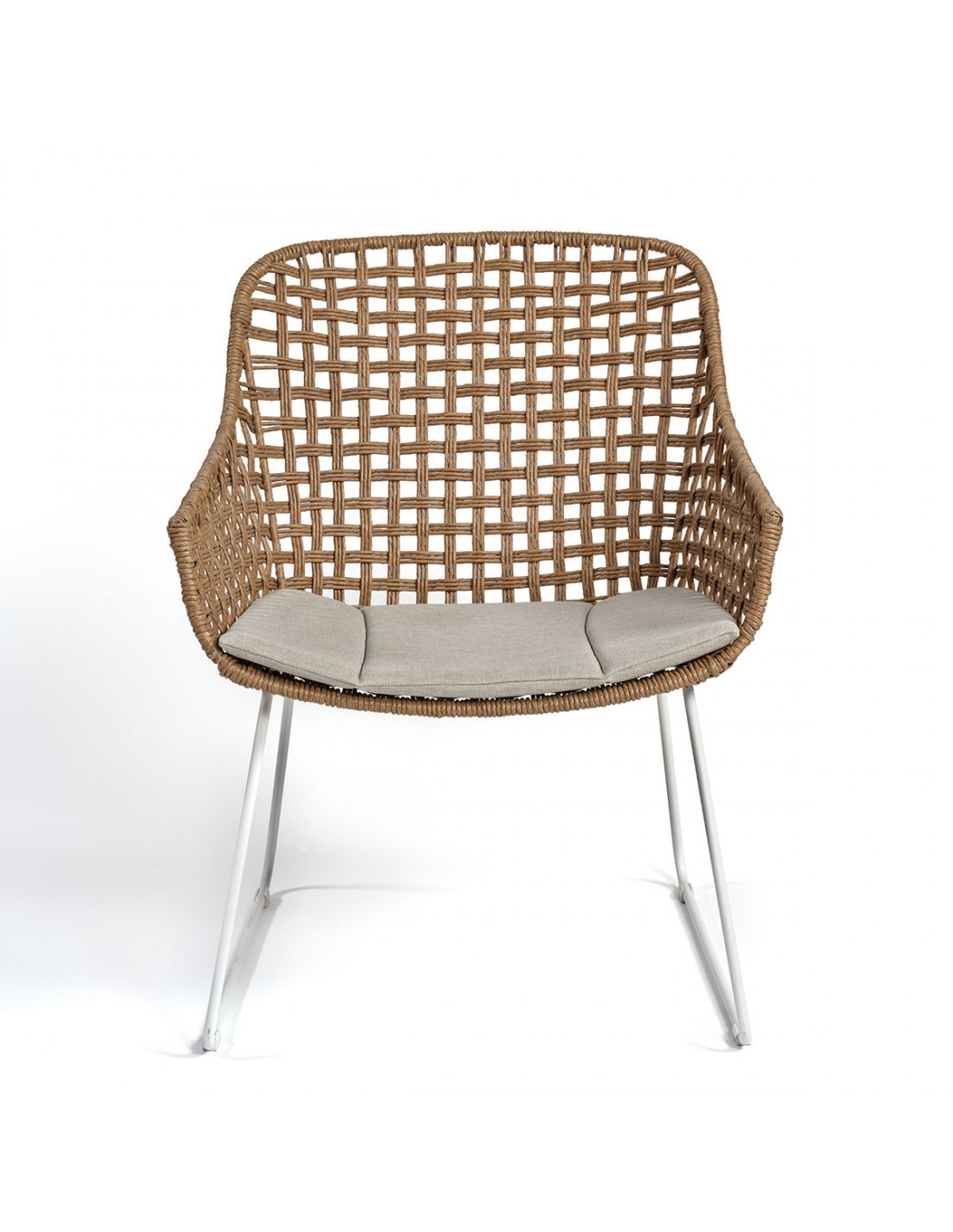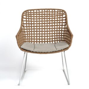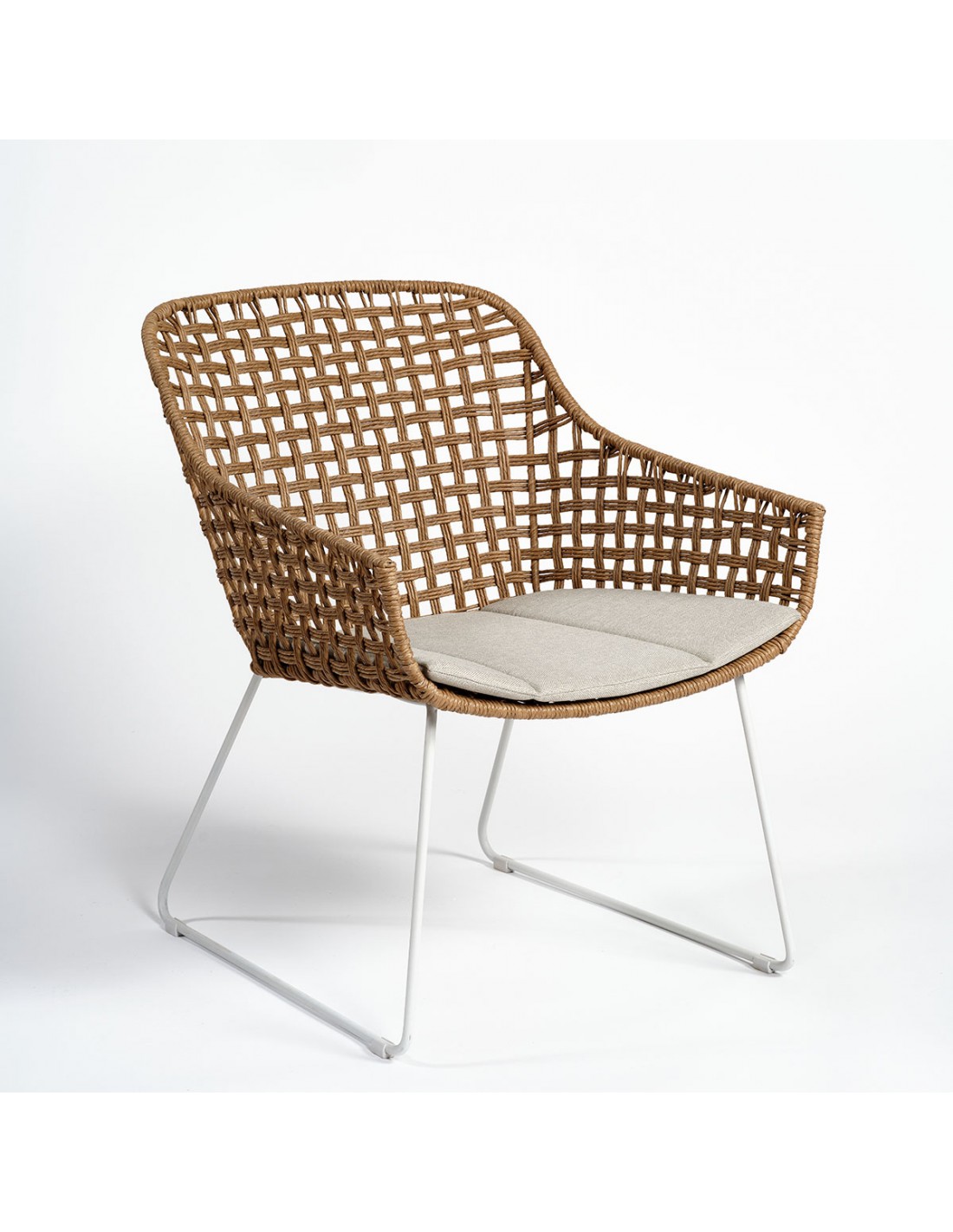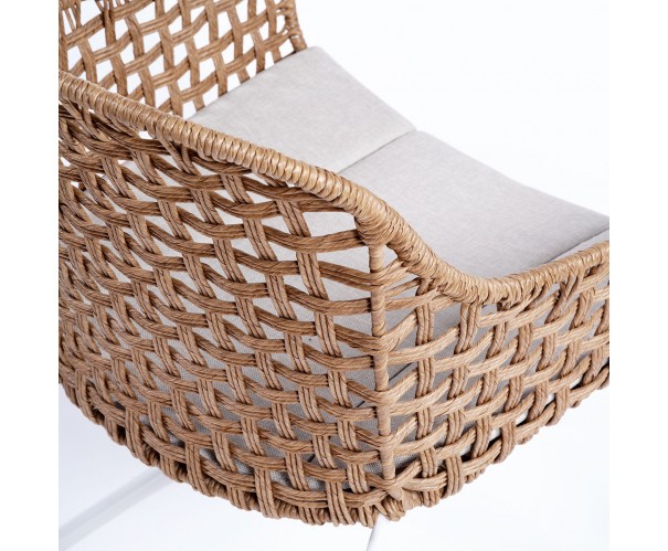 Sillón de exterior ratán sintético color natural tostado y pata color gris claro. cuenta con cojín en tono gris claro , una pieza neutra para combinar con otro mobiliario de estos tonos y crear la zona chill-out perfecta. Dimensiones: 64,5x74x80