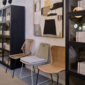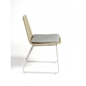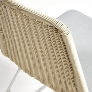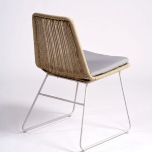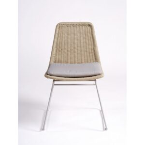 Silla de ratán sintético color tiza. Estructura de las patas de metal en color blanco piedra. Silla apta para exterior en zona cubierta. Cuenta con un cojín en tonos similares para aportar mayor comodidad. También disponible en modelo sillón con brazos en altura de comedor.