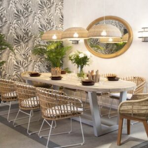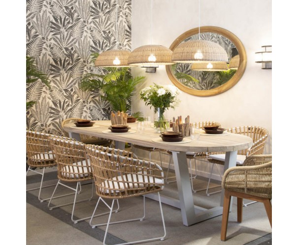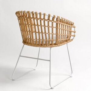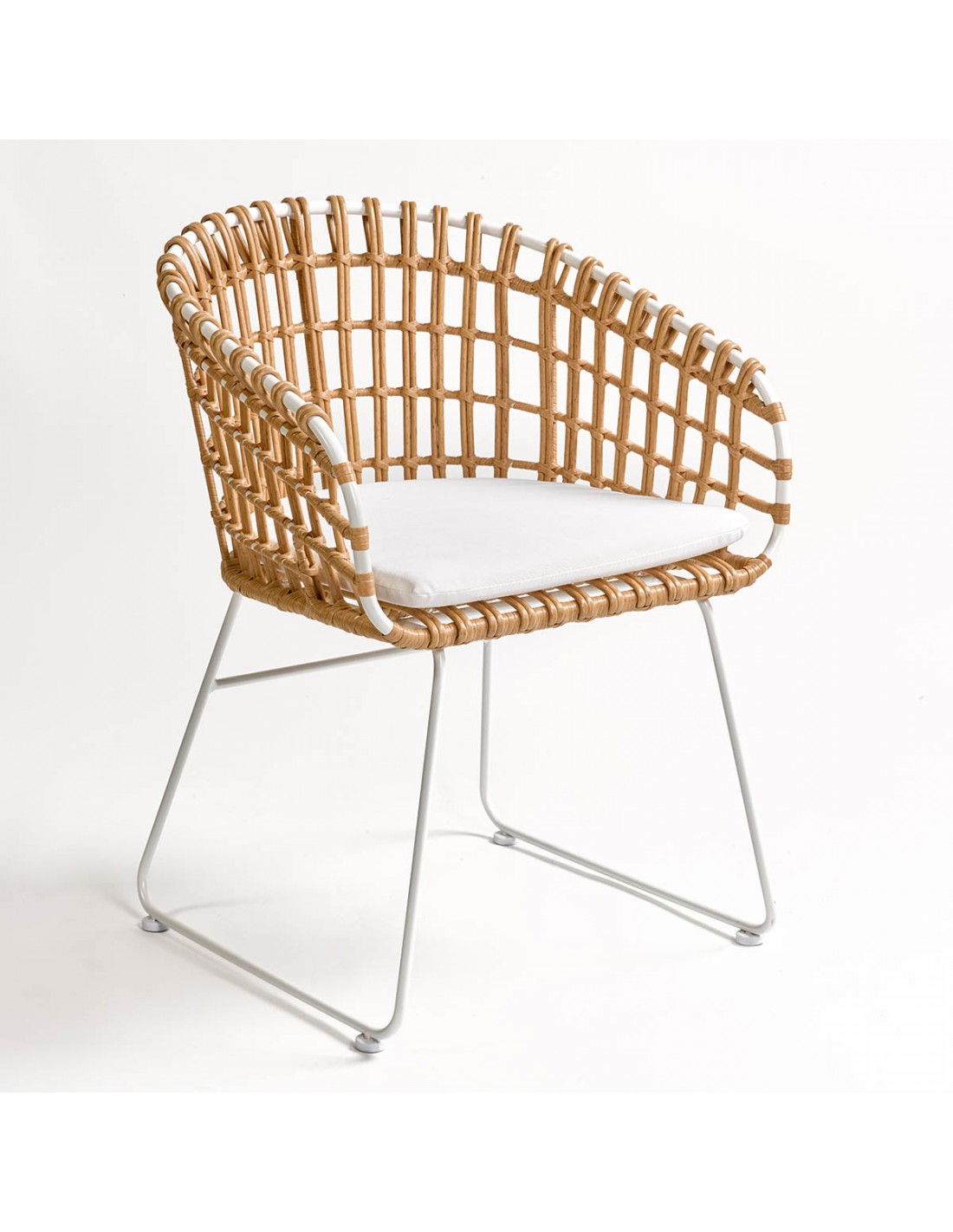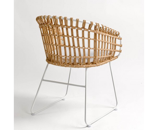 Silla de ratán con pata blanca. Esta hermosa silla de exterior se caracteriza por su novedosa estructura redondeada, ideales de esta temporada. Deja a un lado lo tradicional y rompe con lo modelo y actual. Dispone de un cojín color blanco para dar mayor comodidad. Ideal para exterior y pensado para esas comidas con amigos y familiares donde las horas se vuelven minutos. ¡No te la pierdas!