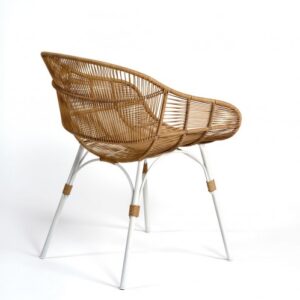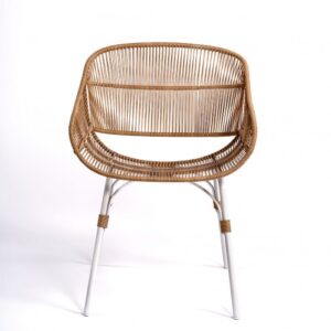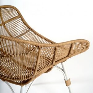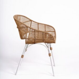 Silla de comedor para exterior de resina color natural y metal color gris piedra. Queda ideal con nuestros modelos de mesas de comedor para exterior de gran tamaño JOEL, JOEL-S o cualquiera de los modelos de madera de teca blanqueada. Gracias a sus brazos es un silloncito ideal para largas sobremesas al aire libre.