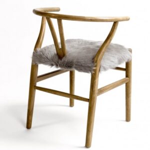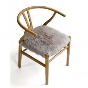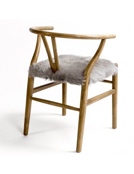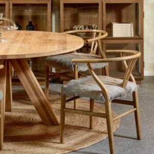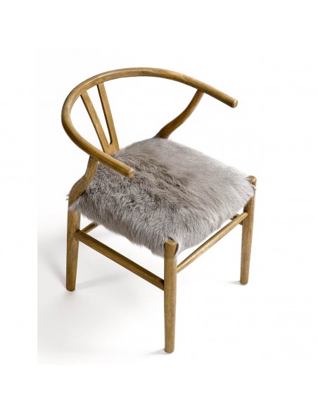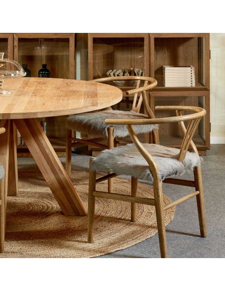 Silla de roble en color natural con asiento de piel. Líneas simples y un respaldo curvo que aportan mayor comodidad. El asiento de piel en tonos claros es el toque distintivo de esta pieza.