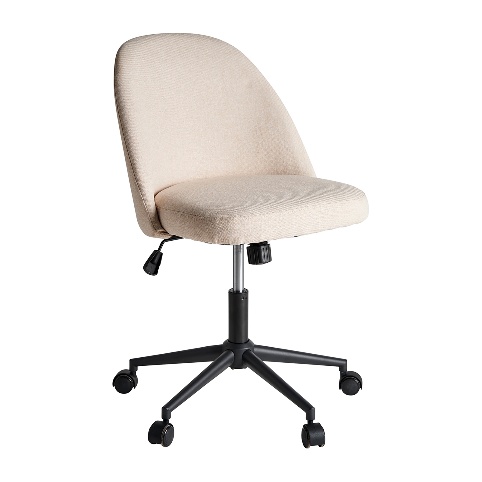 Tapizada en un elegante color crema, la silla de escritorio Sindia combina una estructura sencilla y versátil con cinco patas de hierro en color negro mate. Una combinación de colores exitosa y elegante que quedará perfecta en cualquier ambiente de trabajo.