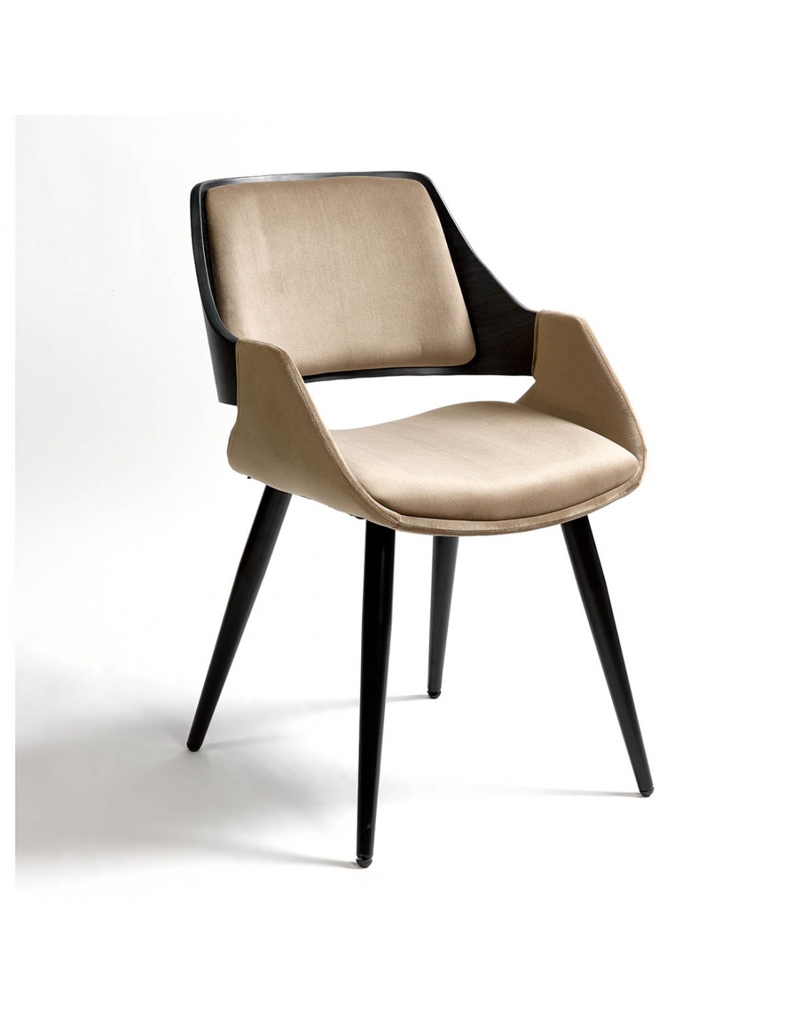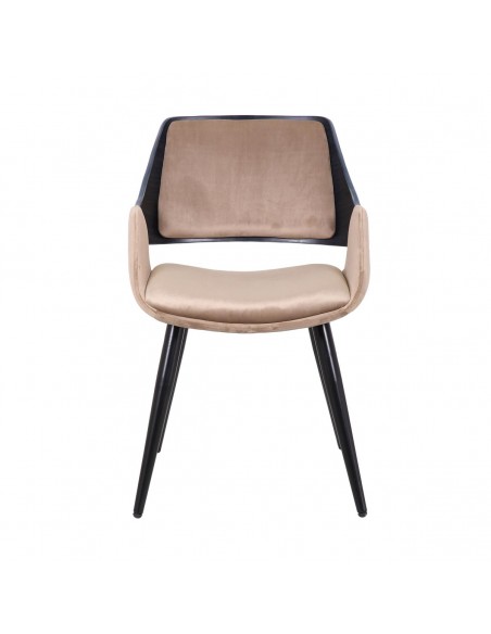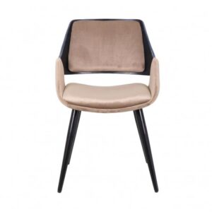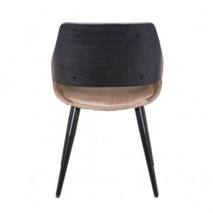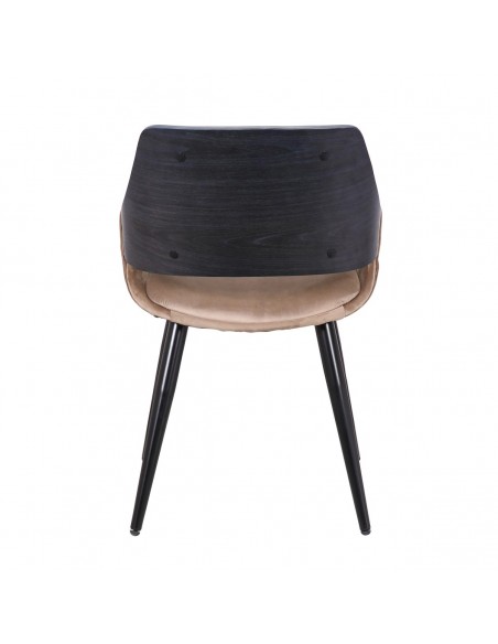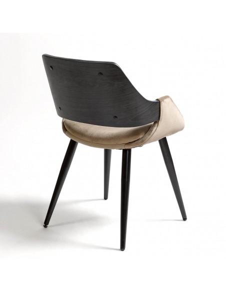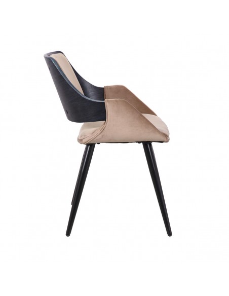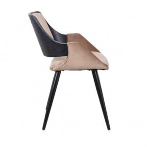 Silla con brazo tapizada en color topo y patas de metal negras. Su respaldo combina tapizado en el mismo color topo y madera en color oscuro.