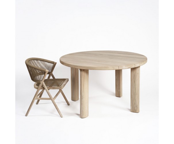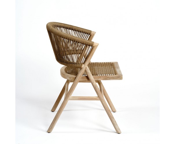 Silla de comedor de madera de teca blanqueada y cuerda en color camel. Un original diseño con el asiento de líneas rectas y el respaldo curvo que aporta mayor comodidad. Es apta para uso en exterior.