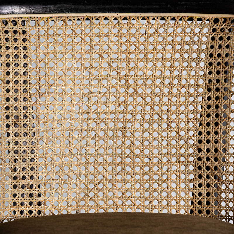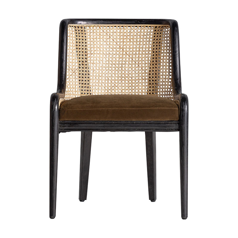 Silla Velburg de estilo colonial fabricado en ratán en color marrón combinado con madera de caucho en color negra y terciopelo en color camel.