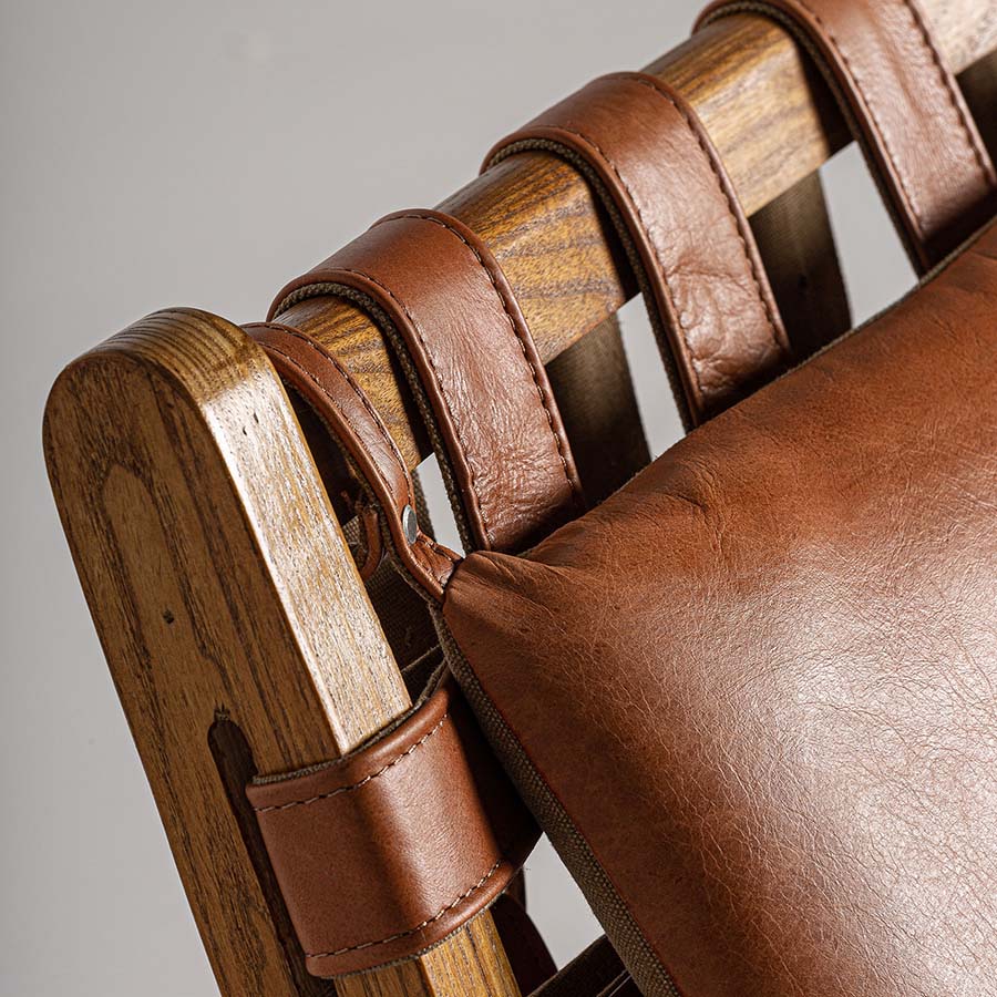 Sillón alford de estilo art deco fabricado en piel en color marrón combinado con madera de fresno. Producto desmontable desenfundable.