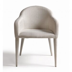 Sillón tapizado en tela con textura en color blanco. Silla con patas forradas en el mismo tapizado y con brazos para mayor comodidad. La estructura y acabado de la silla es de líneas depuradas y sencillas de estilo contemporáneo, muy versátil para varios estilos de ambientes