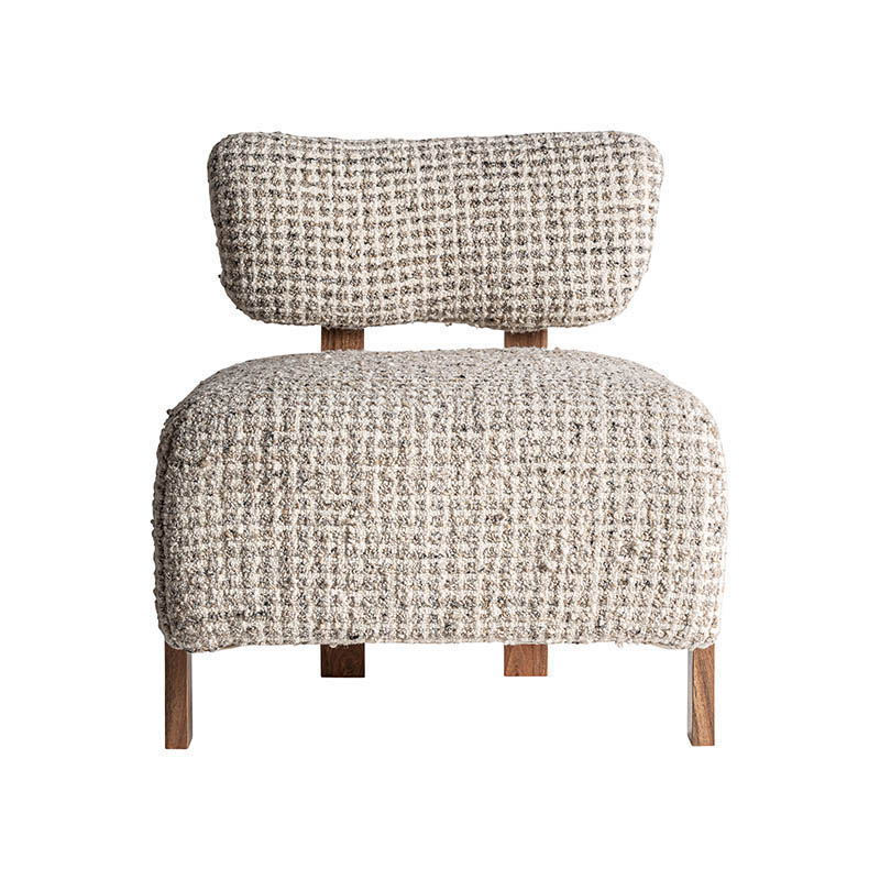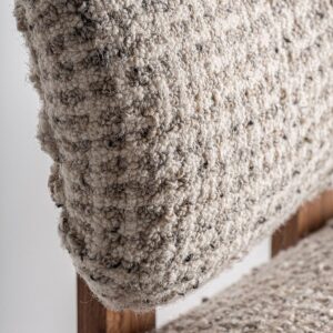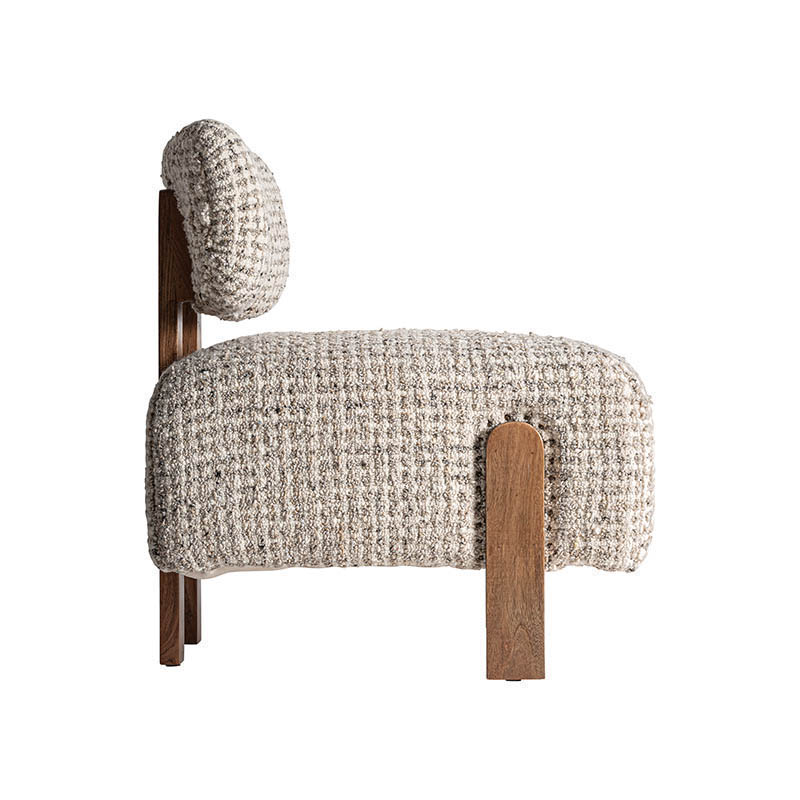 Sillón buhl de estilo art deco fabricado en madera de acacia en color marrón combinado con lana en color beige.