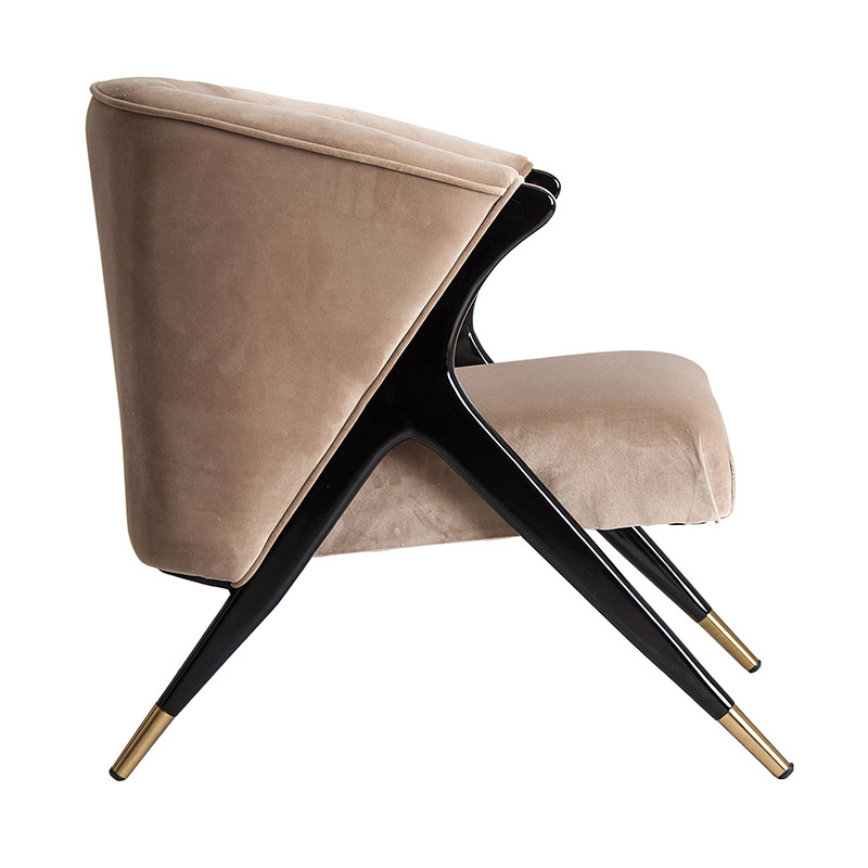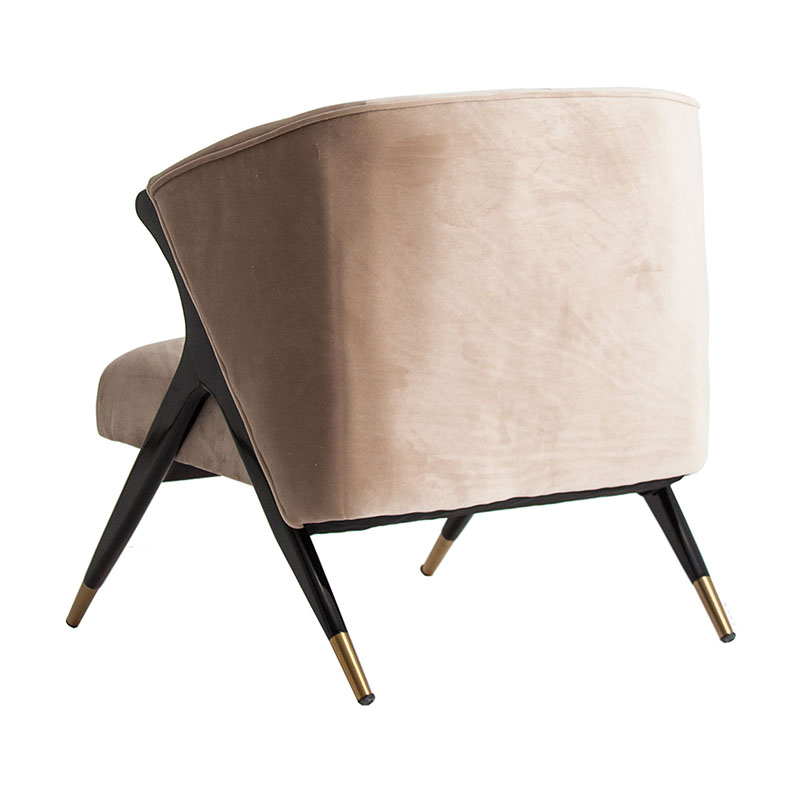 Sillón carei, en color topo, de estilo art deco. Fabricado en madera de pino, combinado con madera de caucho y terciopelo.