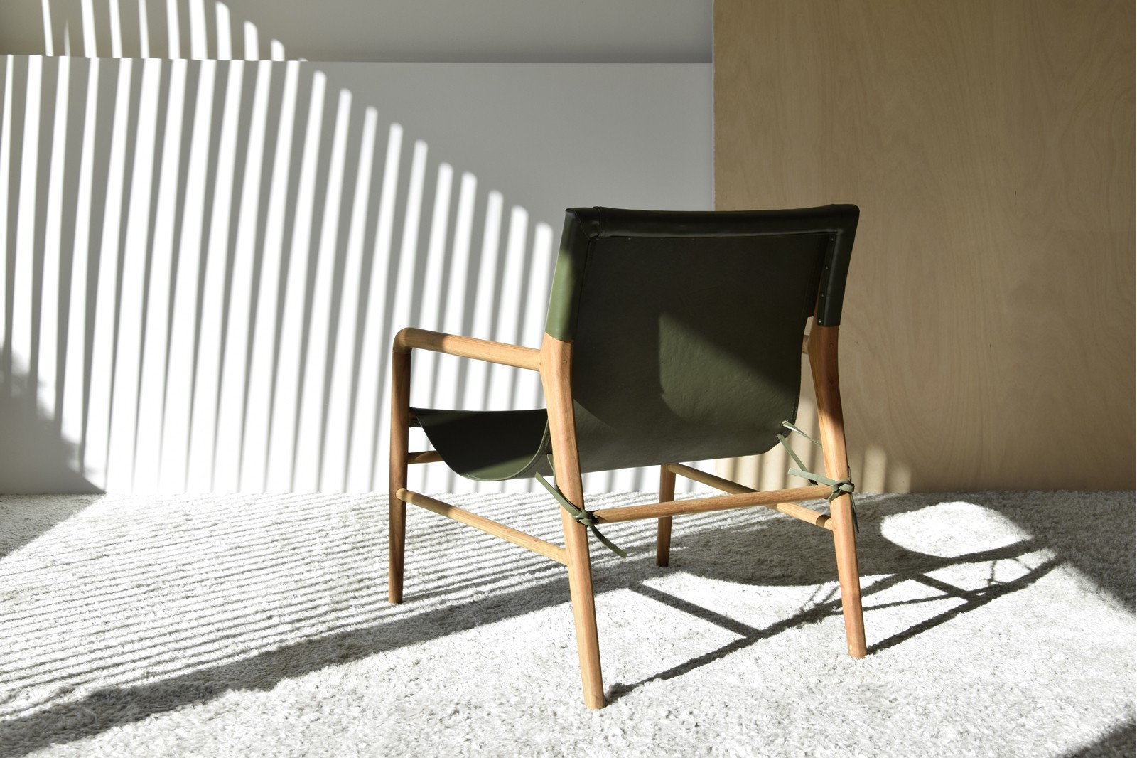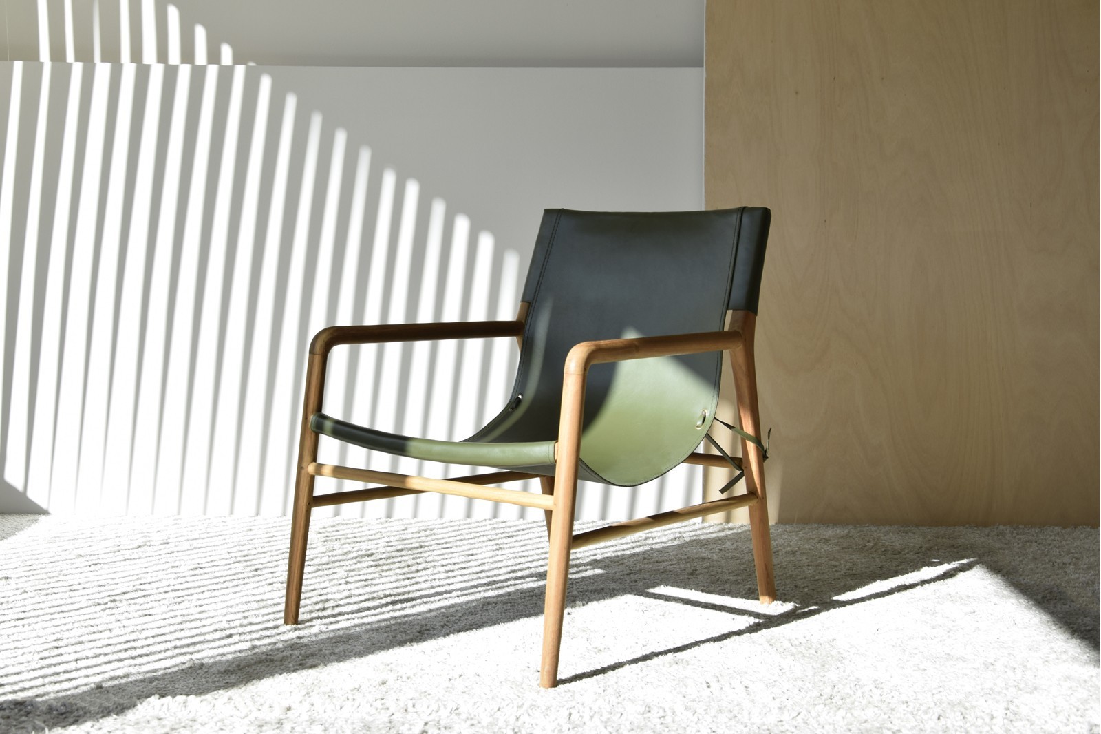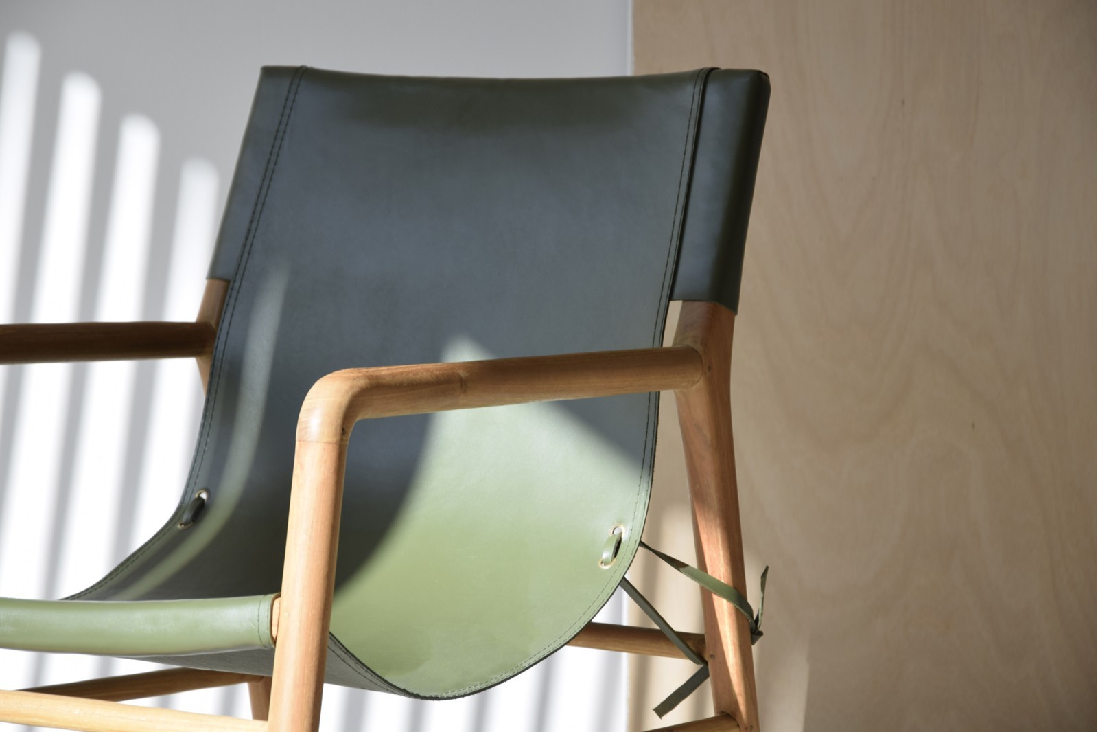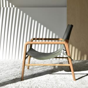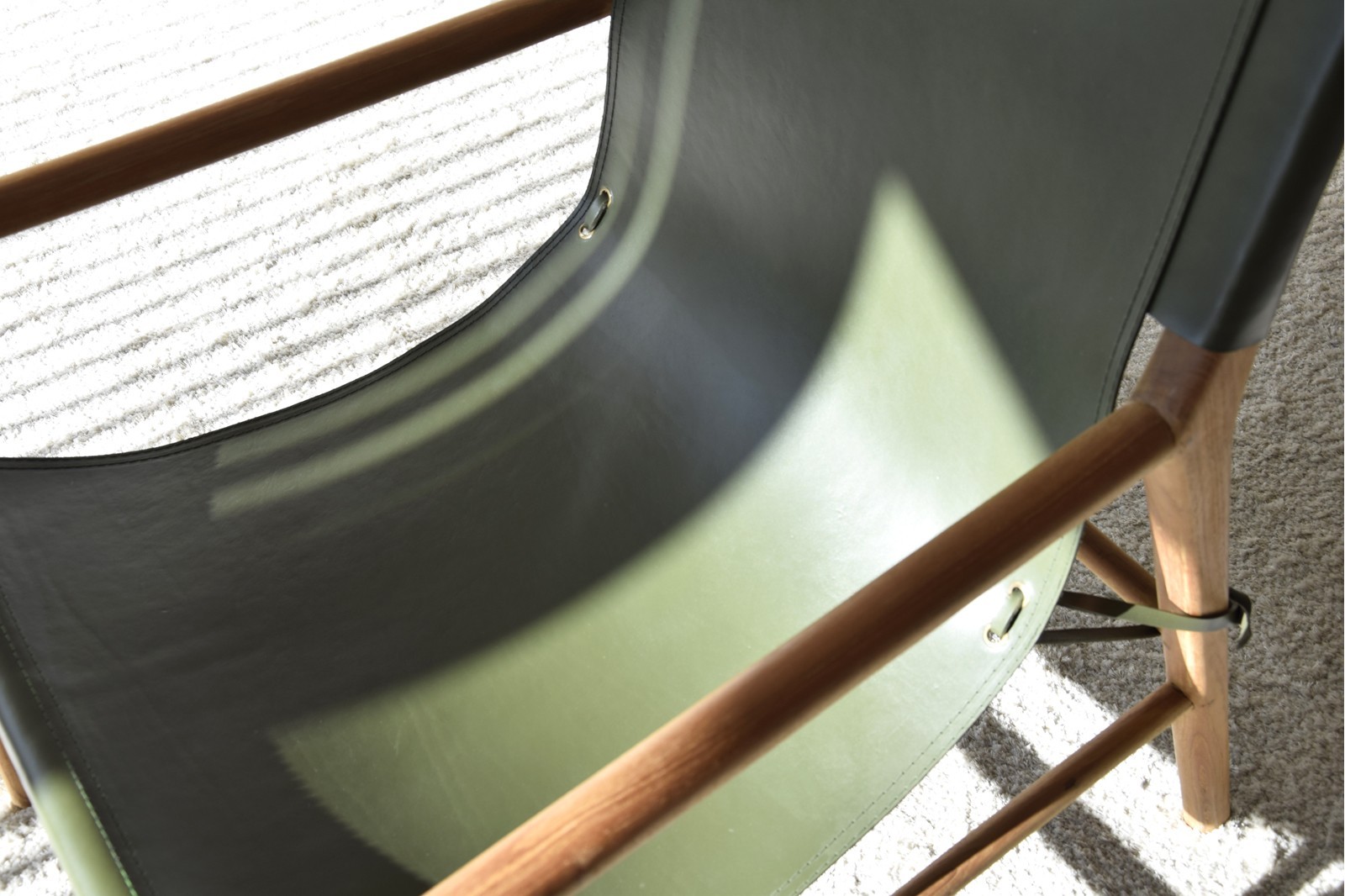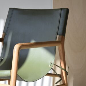 BUTACA COLOMBO CON ESTRUCTURA EN MADERA DE TECA Y ASIENTO EN PIEL DE VACUNO. MADERA EN COLOR NATURAL Y PIEL EN COLOR VERDE. DEBIDO A LA UTILIZACIÓN DE MATERIALES NATURALES PUEDE HABER VARIACIONES DE COLOR DE UNA PIEZA A OTRA Y MARCAS E IMPERFECCIONES PROPIAS DE LA PIEL NATURAL.