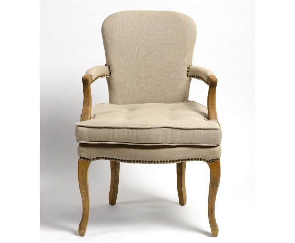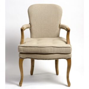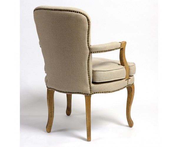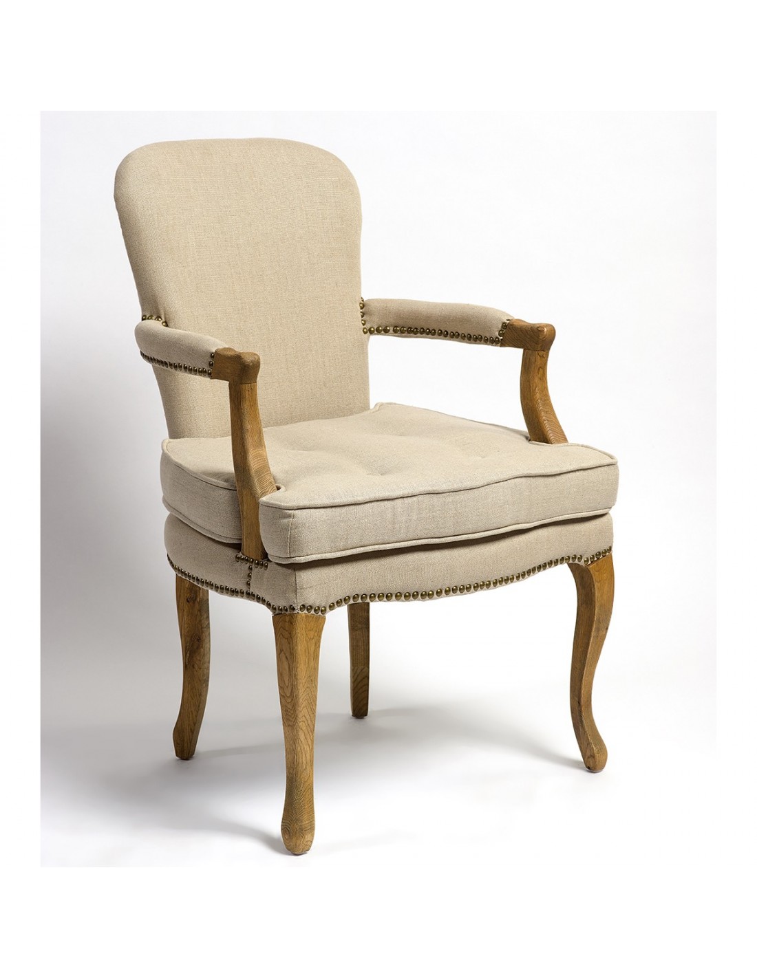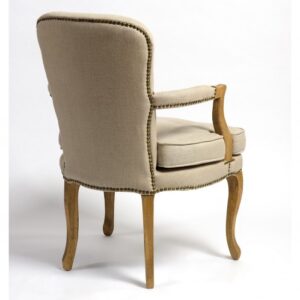 Sillón de roble de madera natural tapizado en lino de color beige. Crea un ambiente refinado y puro y déjate seducir por este magnífico sillón de lino y madera acabado con tachuelas de color cobrizo. Este sillón es perfecto para brindar a tu decoración de interior el encanto de los grandes castillos franceses. Cómodo y elegante y de fácil combinación.