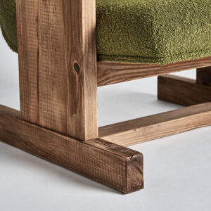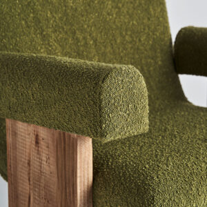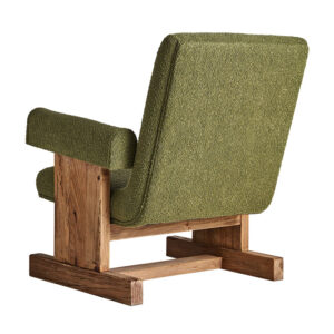 Sillón creusot, en color verde, de estilo art deco. Fabricado en madera de pino reciclado, combinado con algodón bouclé.