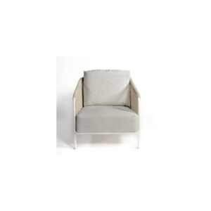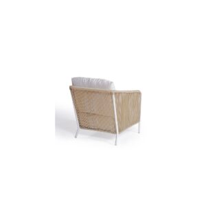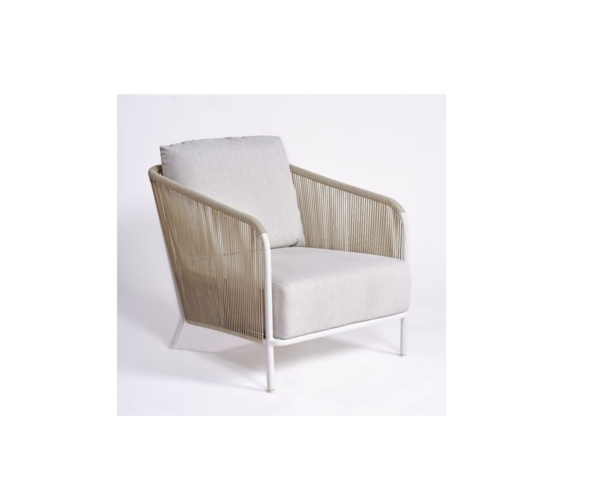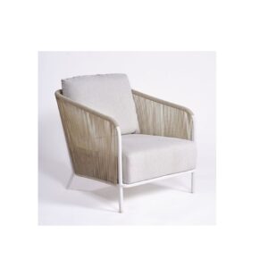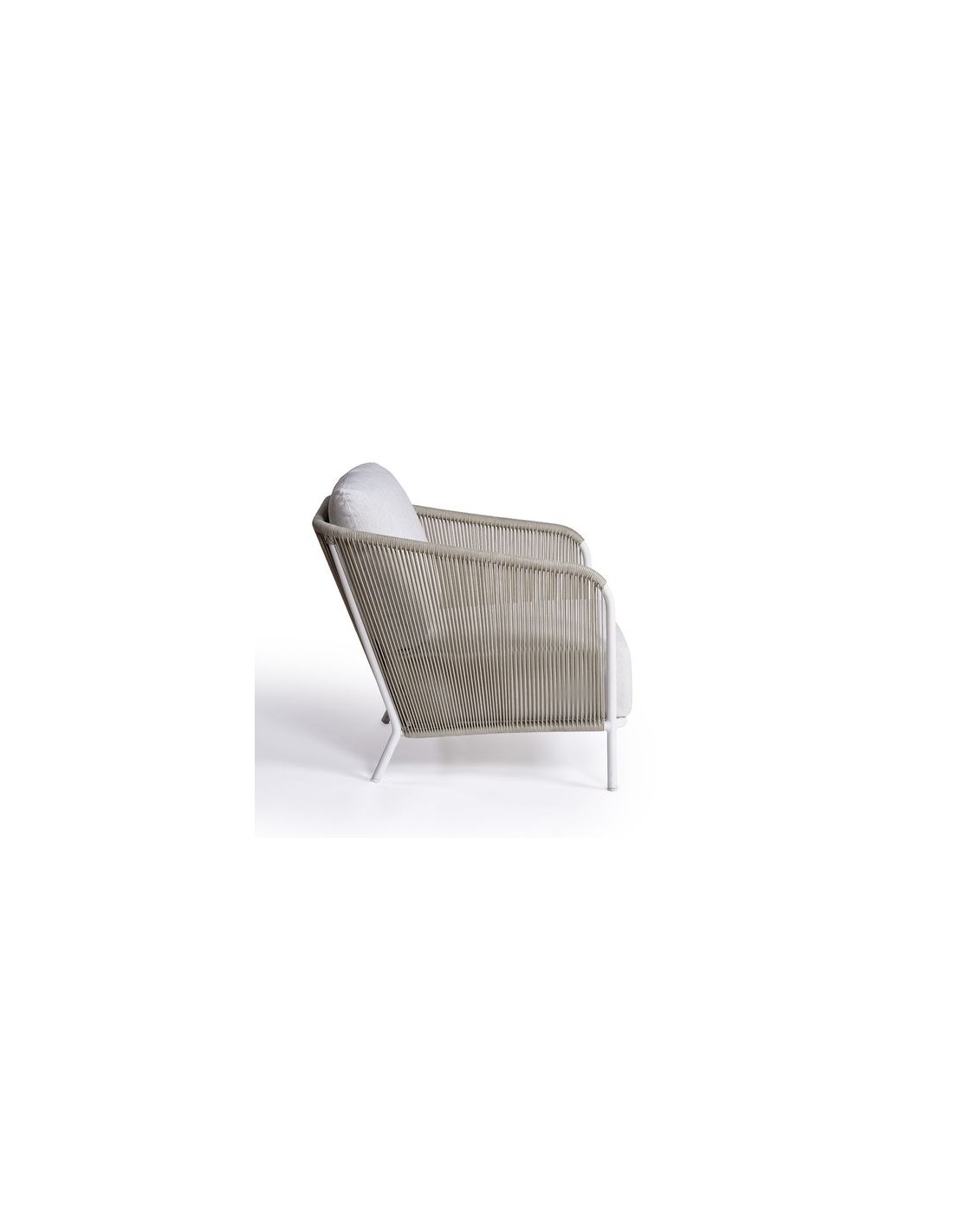 Sillón de exterior de aluminio y tapizado color piedra. Cuenta con estuctura y brazos hechos con cuerda en tono beige. Material sintético apto para uso en exterior. Un asiento de amplio grosor para mayor comodidad y mullido cojín en el respaldo.