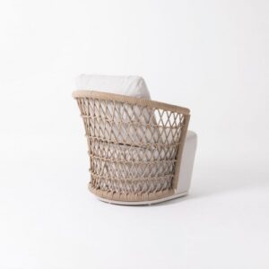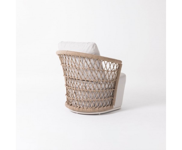 Sillón de cuerda y aluminio apto para exterior. Cuerda color natural en forma de red y estructura de aluminio en color blanco ivory. Cuenta con cojines tapizados en tejido apto para uso a la itemperie. También disponible en otras medidas de sillón y sofá y acbados de la cuerda.