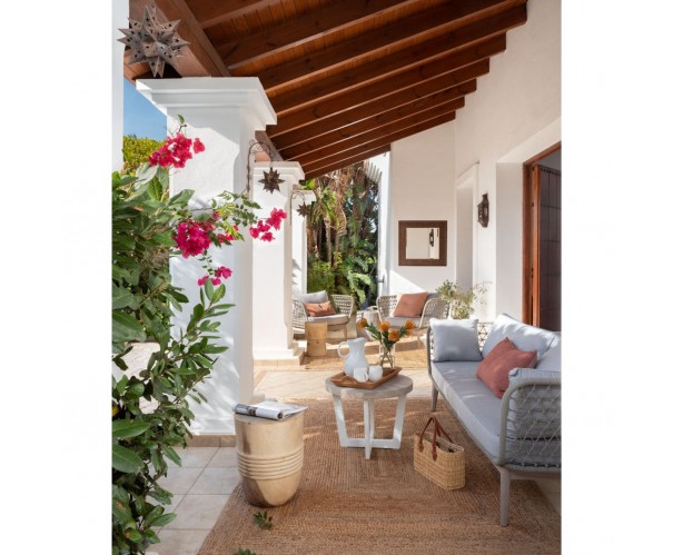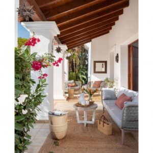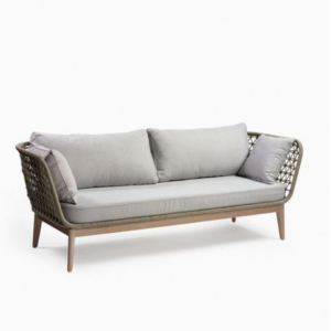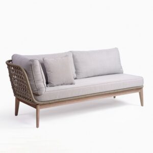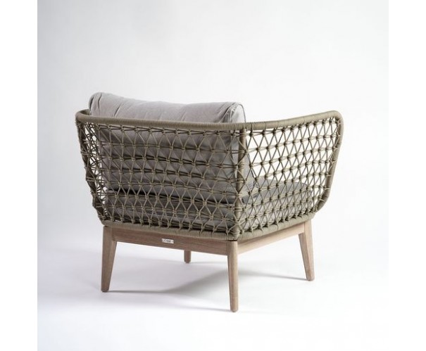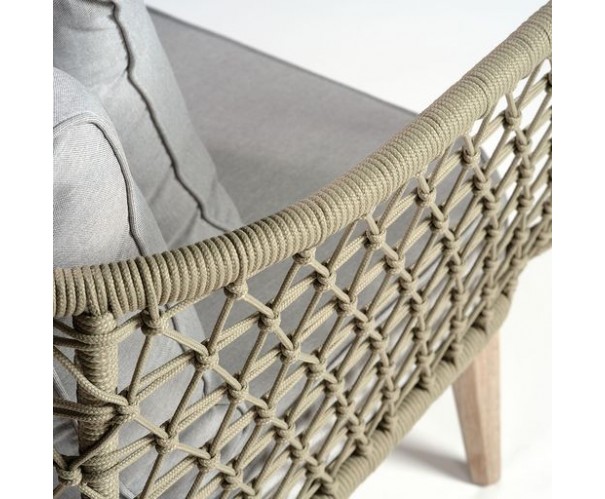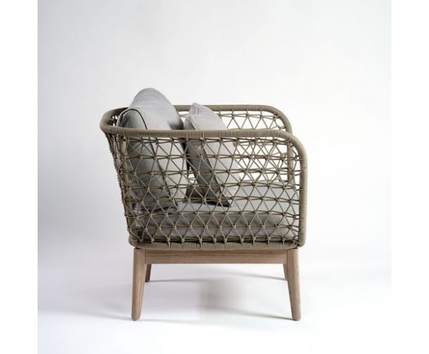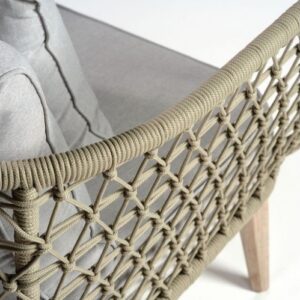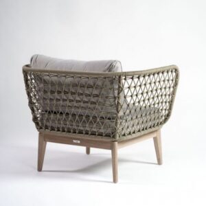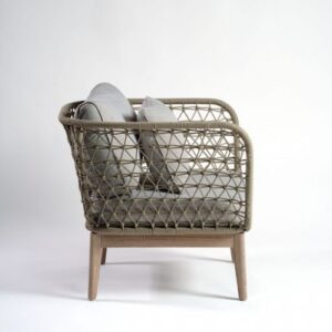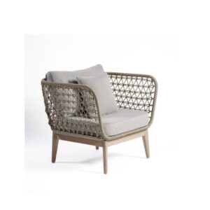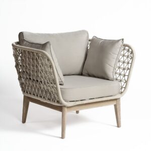 Sillón de una plaza apto para exterior fabricado en madera de eucalipto color grisáceo y cuerda sintética en cemento. Sus cojines le aportan gran comodidad a esta pieza y el diseño con líneas rectas con acabados curvos lo hacen una pieza que aporta mucha armonía al ambiente. Puedes combinarlo con el resto de su colección OSANA en color cemento para hacer un set completo de sofás y sillón de exterior y mesas de la colección IVY, IVORY, KAI o ILIA.