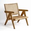 Sillón con patas y brazos de roble natural. Asiento y respaldo en tono natural de rejilla. Cuenta con un asiento acolchado tapizado en lino color oscuro.