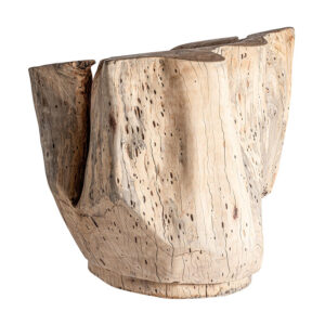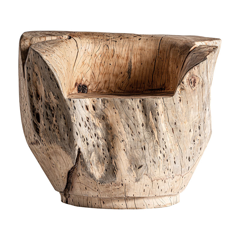Sillón Dharm de estilo étnico fabricado en madera de tamarindo en color marrón con acabado envejecido.