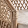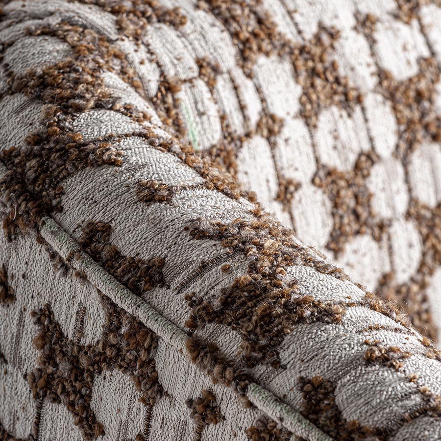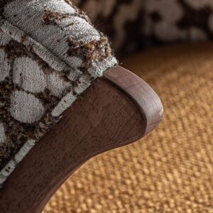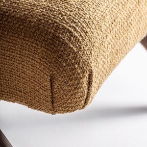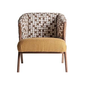 Sillón Kalesha de estilo clásico fabricado en poliéster en color ocre combinado con madera de pino en color marrón y madera de caucho.