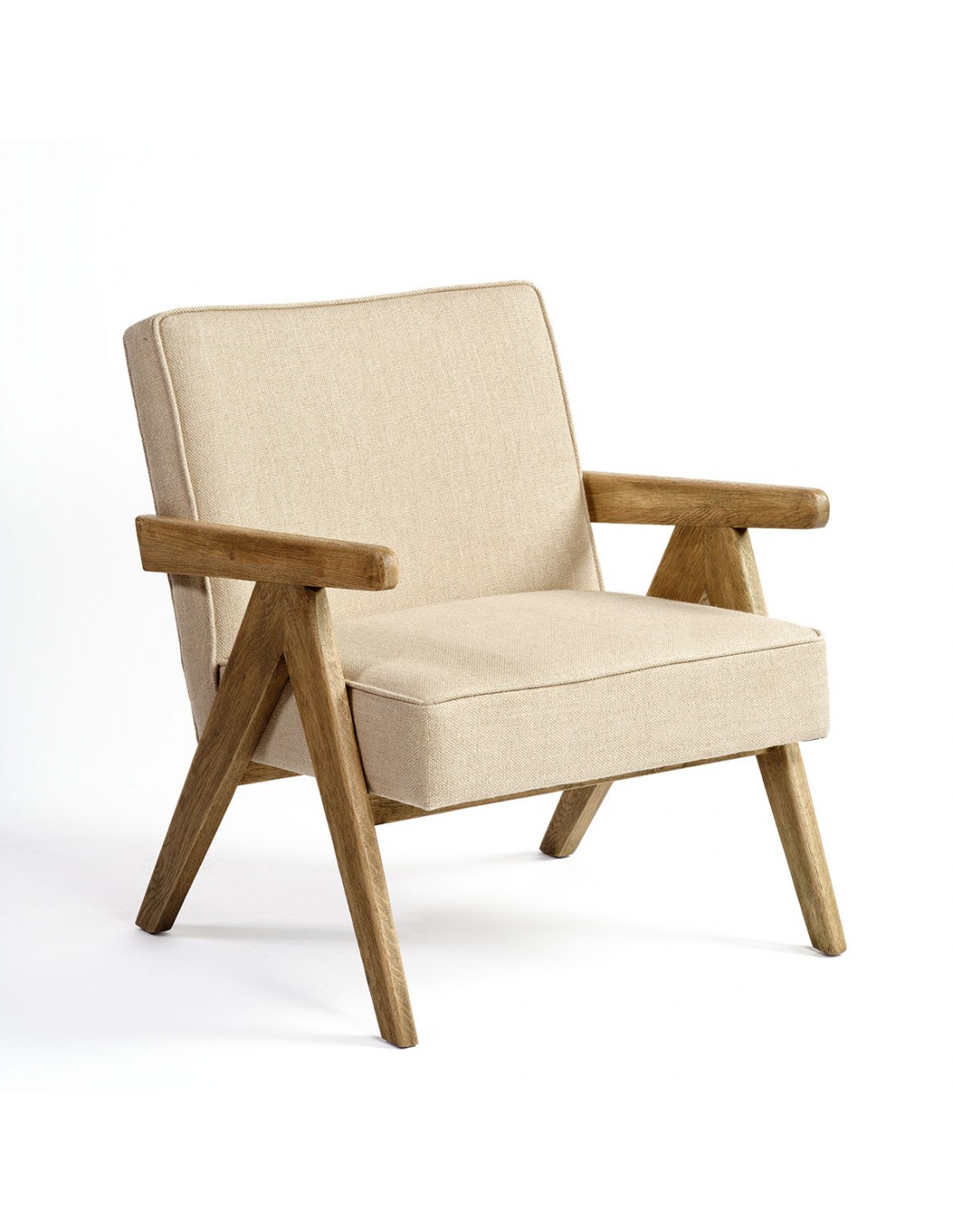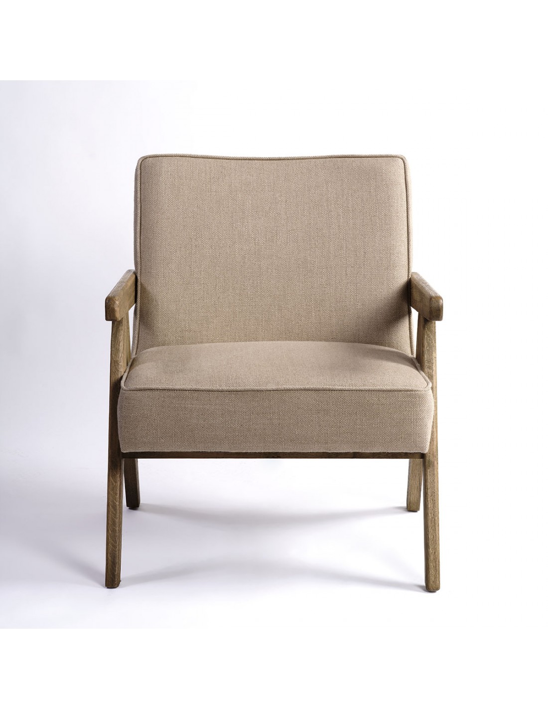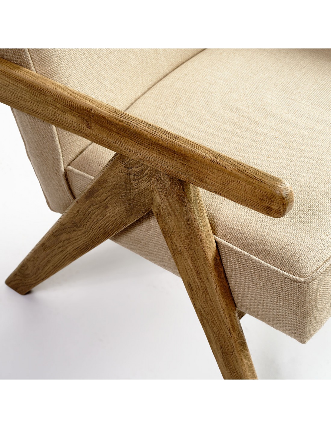 Sillón tapizado en lino color beige con estructura de madera de roble color natural. Una pieza singular, elegante y con un perfil con líneas rectas. También disponbile opciones con otros acabados, respaldos y reposabrazos.