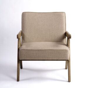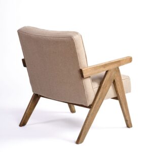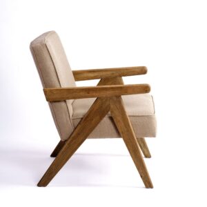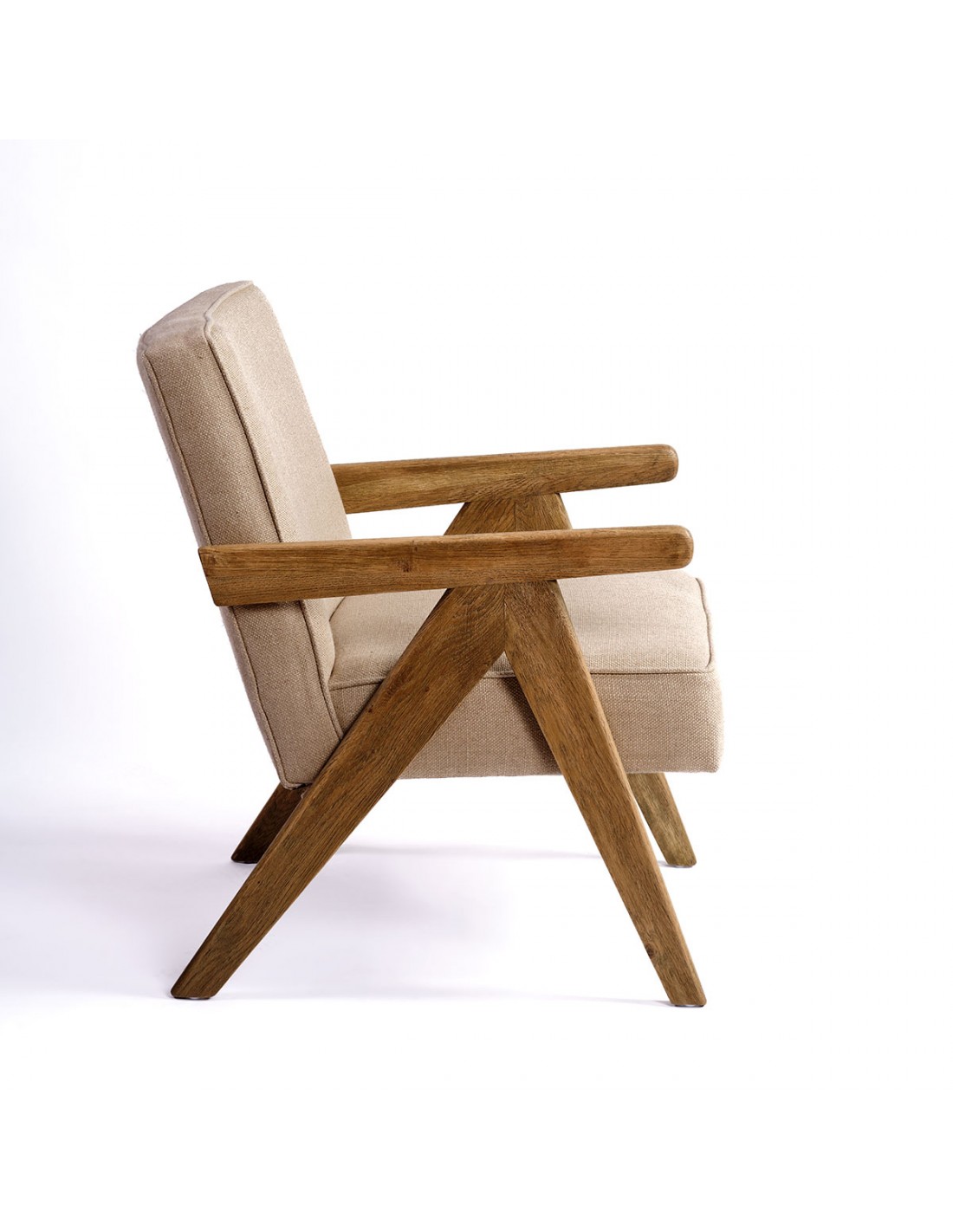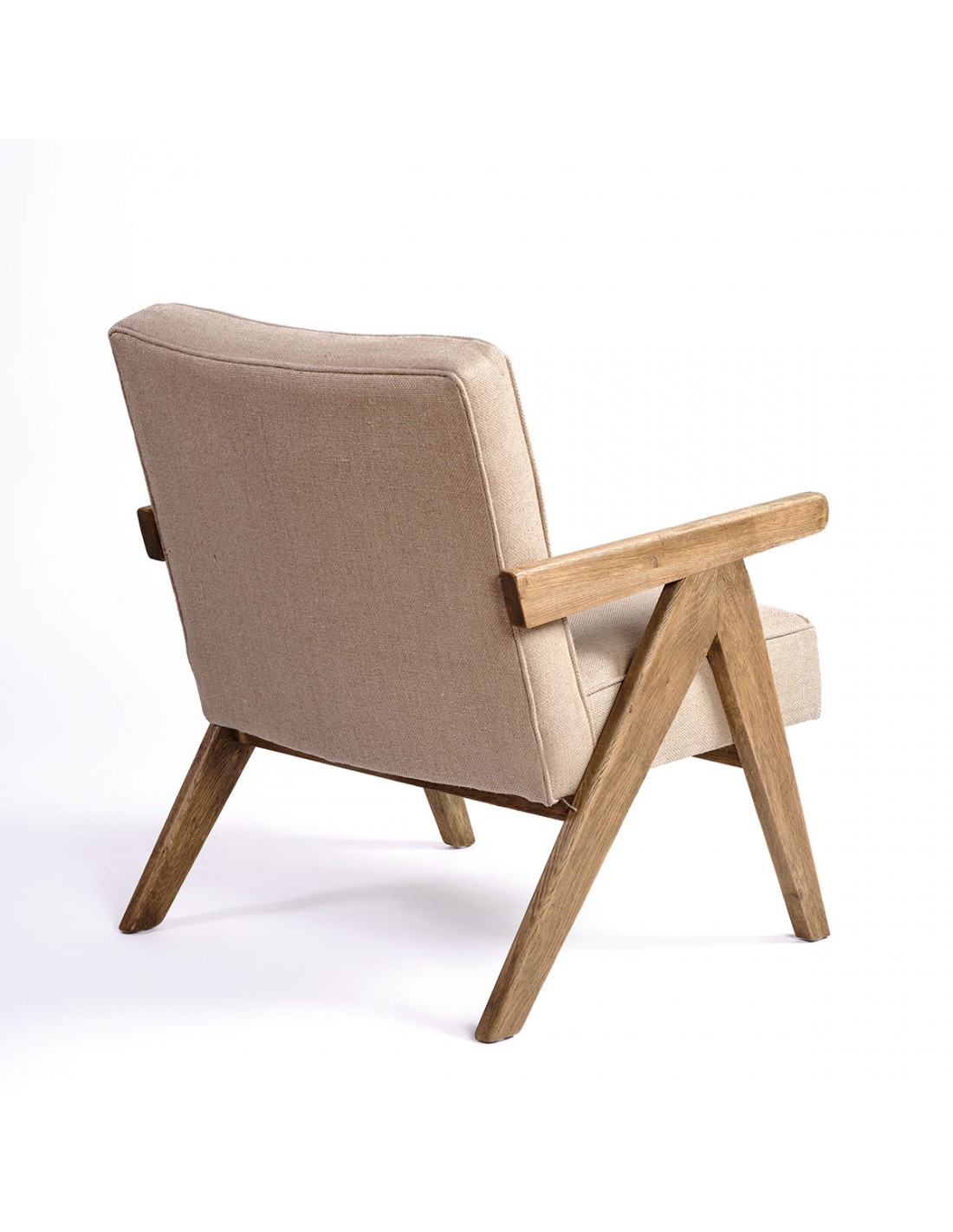 Sillón tapizado en lino color beige con estructura de madera de roble color natural. Una pieza singular, elegante y con un perfil con líneas rectas. También disponbile opciones con otros acabados, respaldos y reposabrazos.