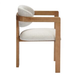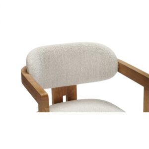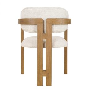 Sillón de comedor con estructura de madera y tapizado en tono claro. Su original estructura le aporta a la pieza personalidad haciéndolo una pieza protagonista en tu mesa de comedor o como sillón para sala de estar. Sillón de estilo moderno con líneas rectas y muy estiloso para las decoraciones más exclusivas.