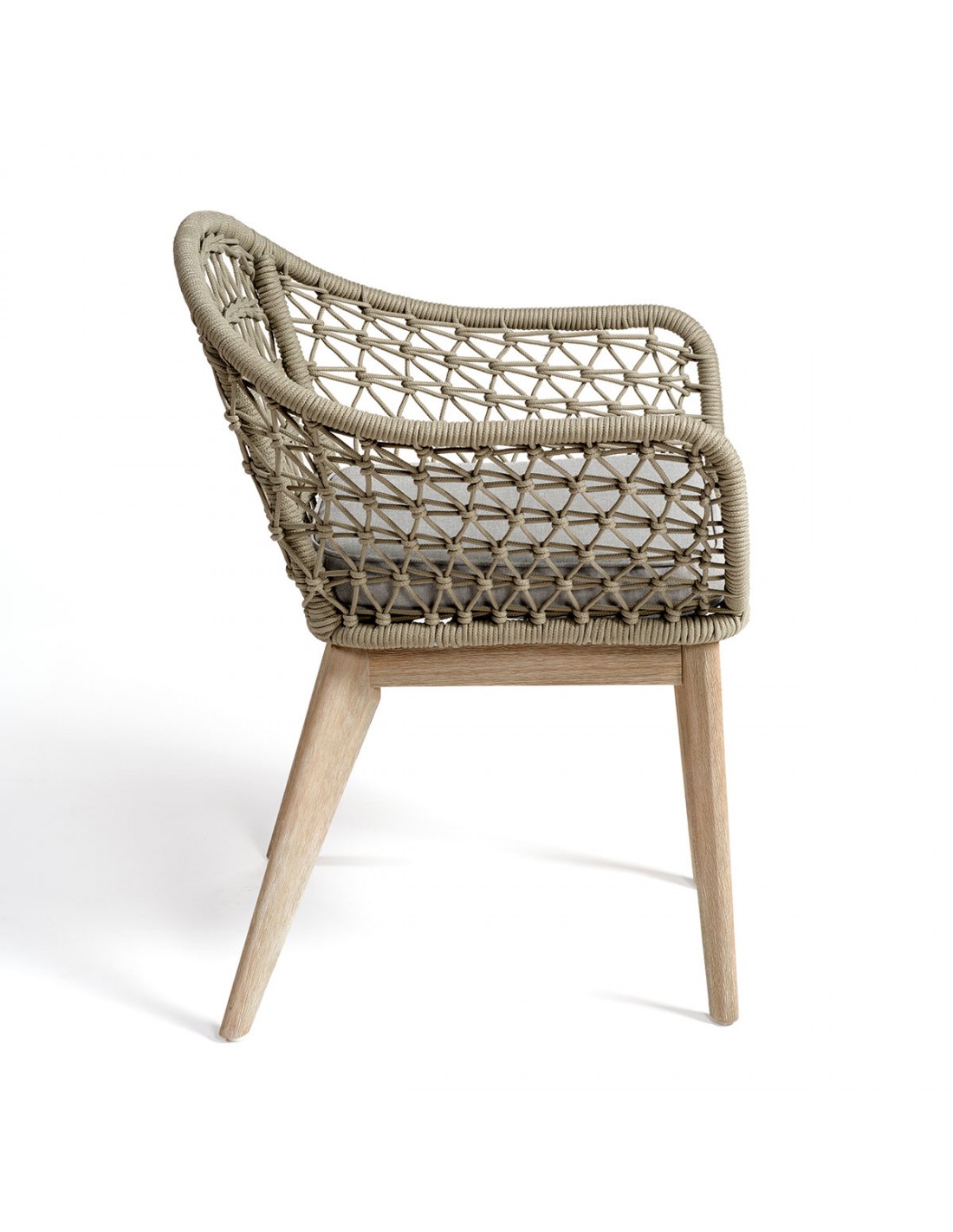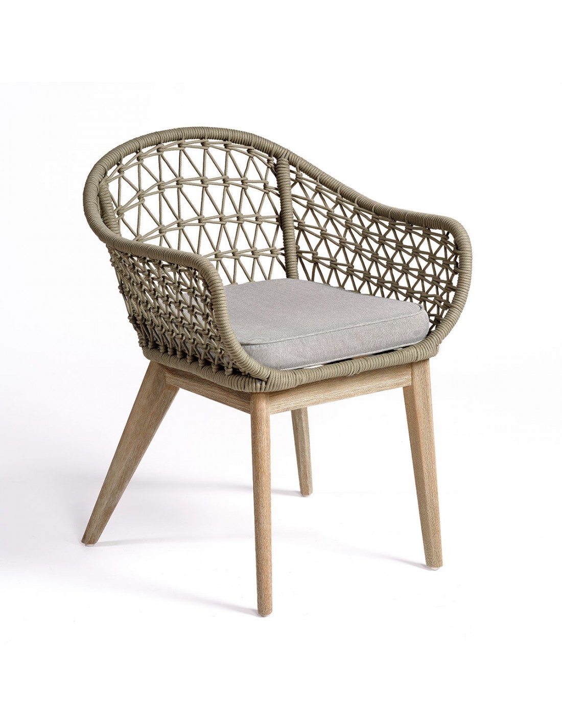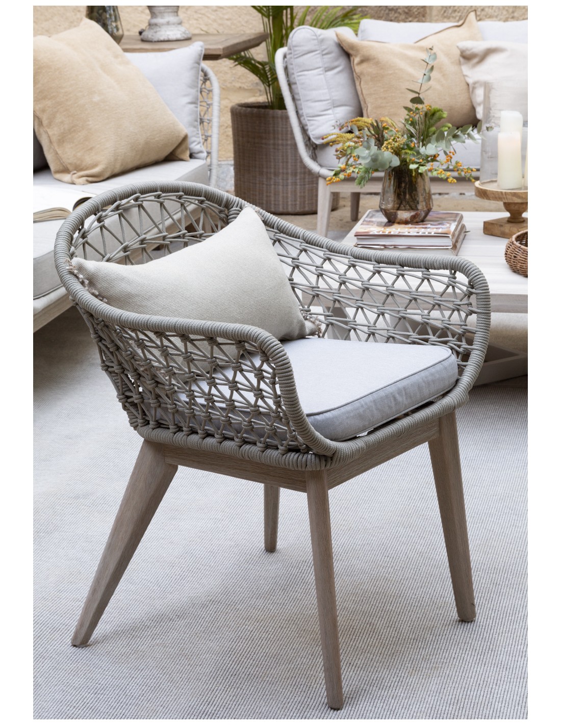 Sillón de comedor apto para exterior con pata de madera de eucalipto y estructura de asiento de cuerda sintética color cemento. Este modelo cuenta con un cojín en el asiento que aportan mayor comodidad. También disponible en color blanco grisáceo.