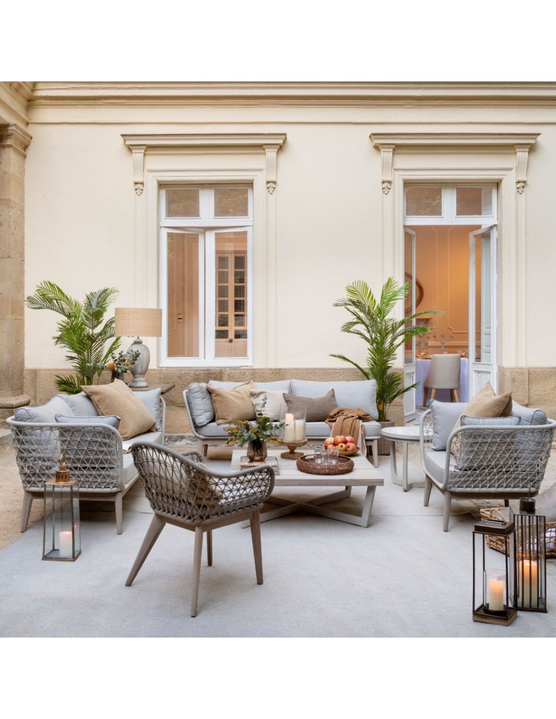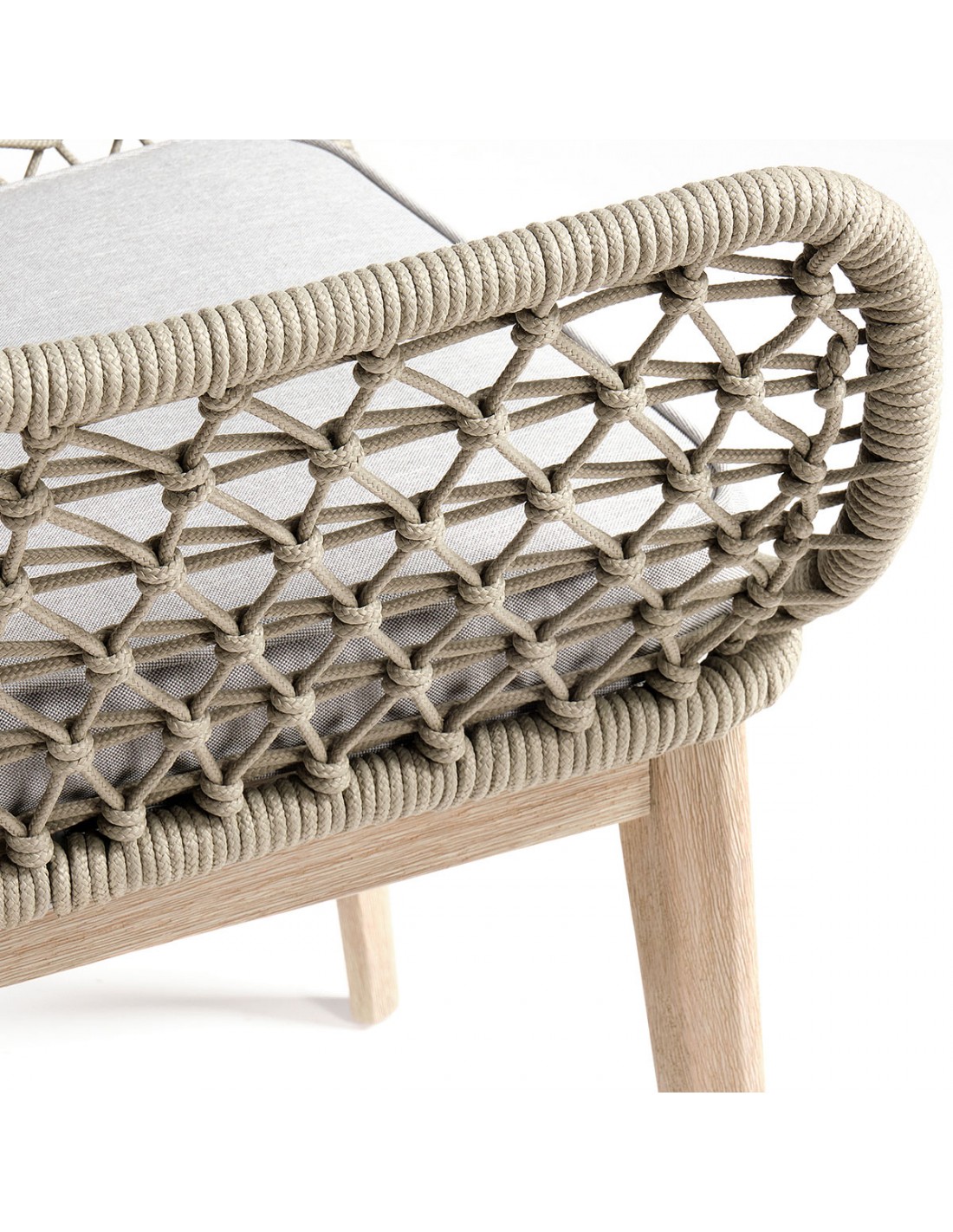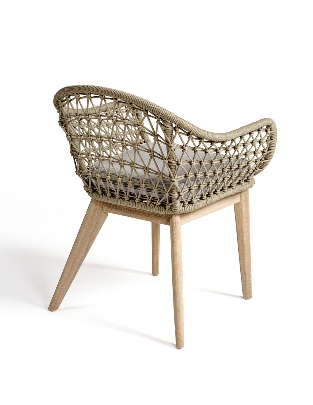 Sillón de comedor apto para exterior con pata de madera de eucalipto y estructura de asiento de cuerda sintética color cemento. Este modelo cuenta con un cojín en el asiento que aportan mayor comodidad. También disponible en color blanco grisáceo.