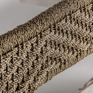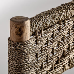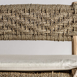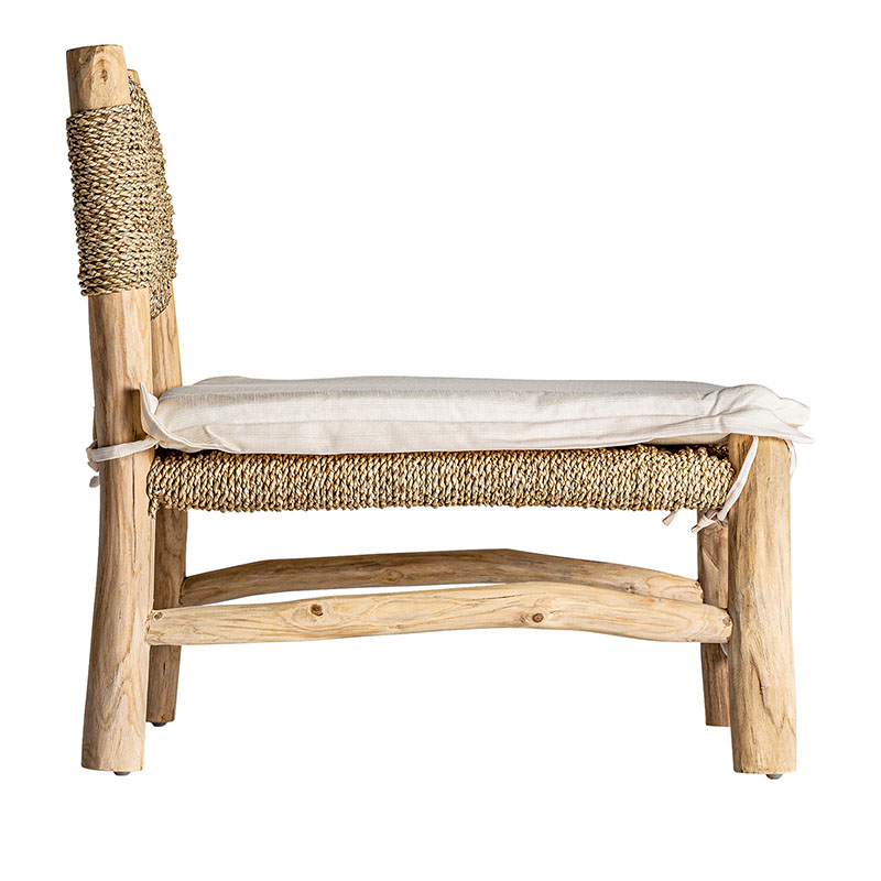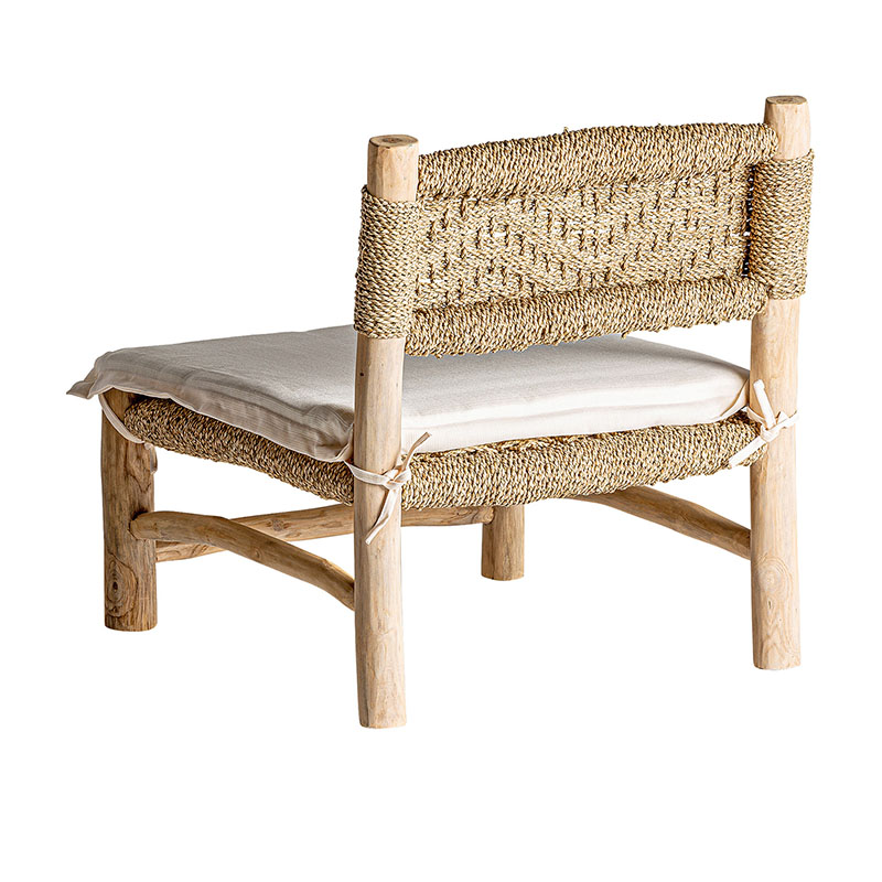 Sillón manhula, en color marrón, de estilo colonial. Fabricado en madera de teka, combinado con fibra natural.