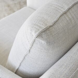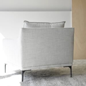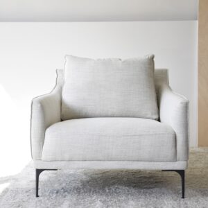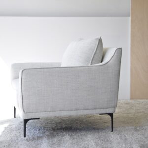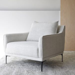 BUTACA TAPIZADA EN MEZCLILLA TONOS BEIGE Y PATAS METÁLICAS EN NEGRO MATE. UN DISEÑO DE FORMATO CUADRADO Y ESTETICA MULLIDA QUE INVITA AL DESCANSO Y RELAJACIÓN. EL TEJIDO EN TONOS BEIGE CON PINCELADAS SUTILES DE GRIS OSCURO COMBINA A LA PERFECCIÓN CON UNAS PATAS METÁLICAS DE ESTÉTICA LIVIANA. TELA N9