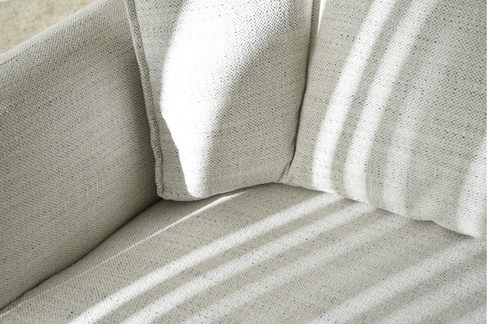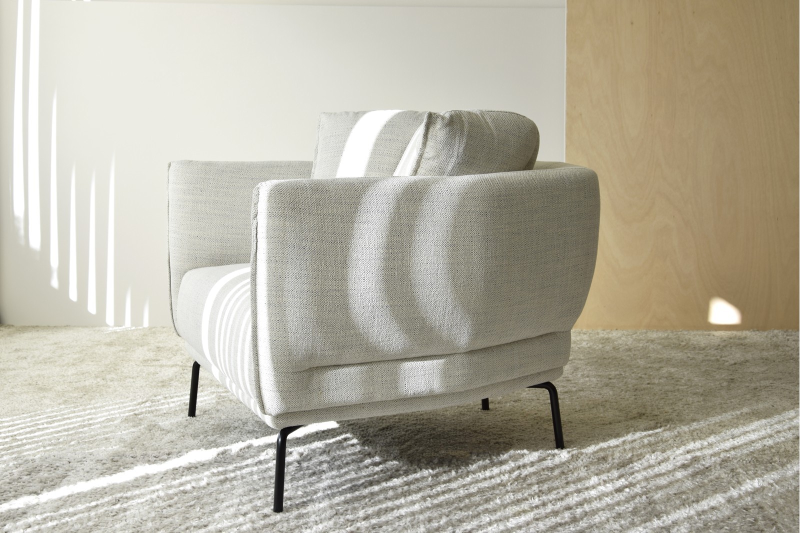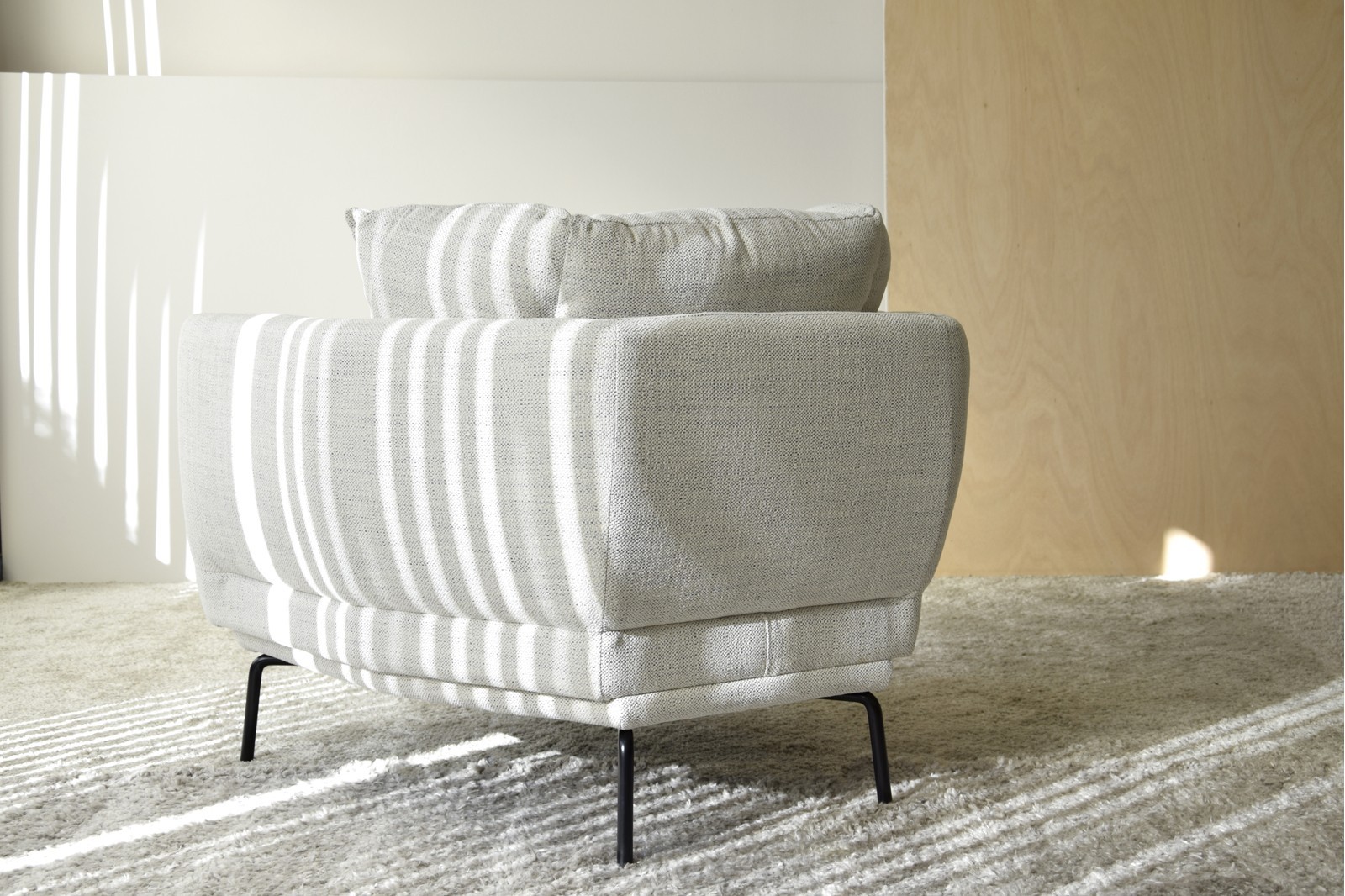 ORIGINAL BUTACA CON RESPALDO REDONDEADO TAPIZADA EN MEZCLILLA DE TONOS BEIGE Y MARFIL CON SUTILES TOQUES EN GRIS OSCURO. PATA METÁLICA EN NEGRO MATE. TELA N9