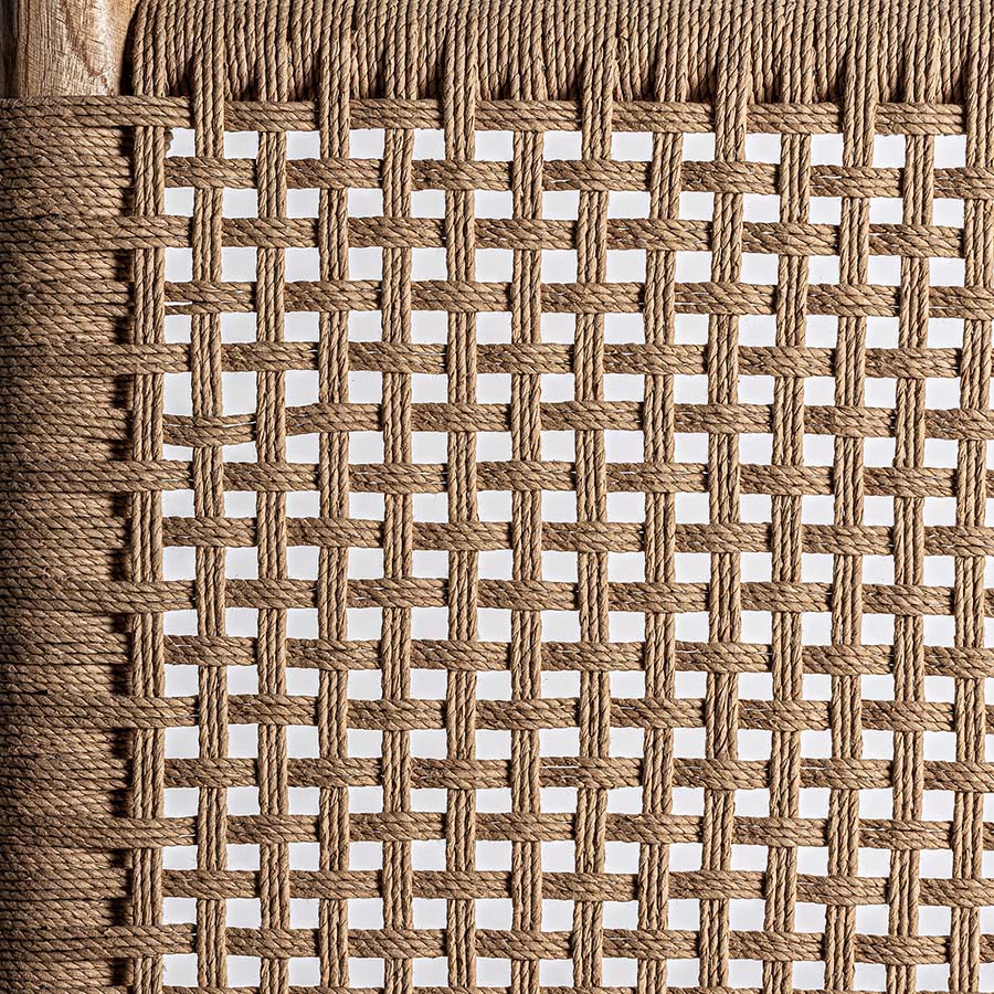 Sillón Mouzaki de estilo vintage fabricado en madera de teka en color marrón claro combinado con cáñamo en color marrón claro.