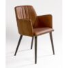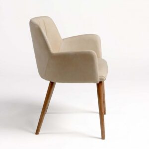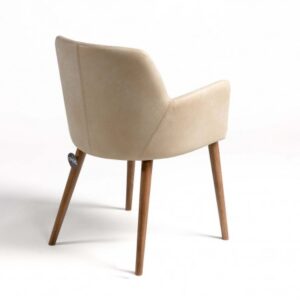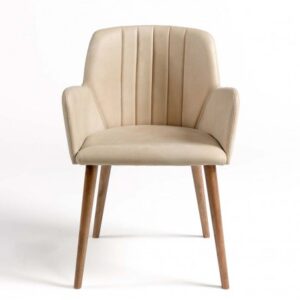 Sillón de piel beige con patas de madera. Elegante diseño de silla con brazos un tono claro elegante. Es la pieza perfecta para mesas de comedor, escritorio o incluso el tocador más sofisticado. Un toque de luminosidad y elegancia en tu proyecto de decoración.