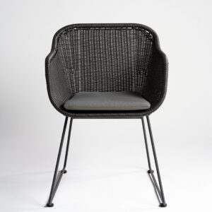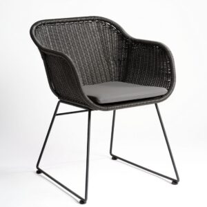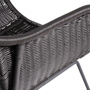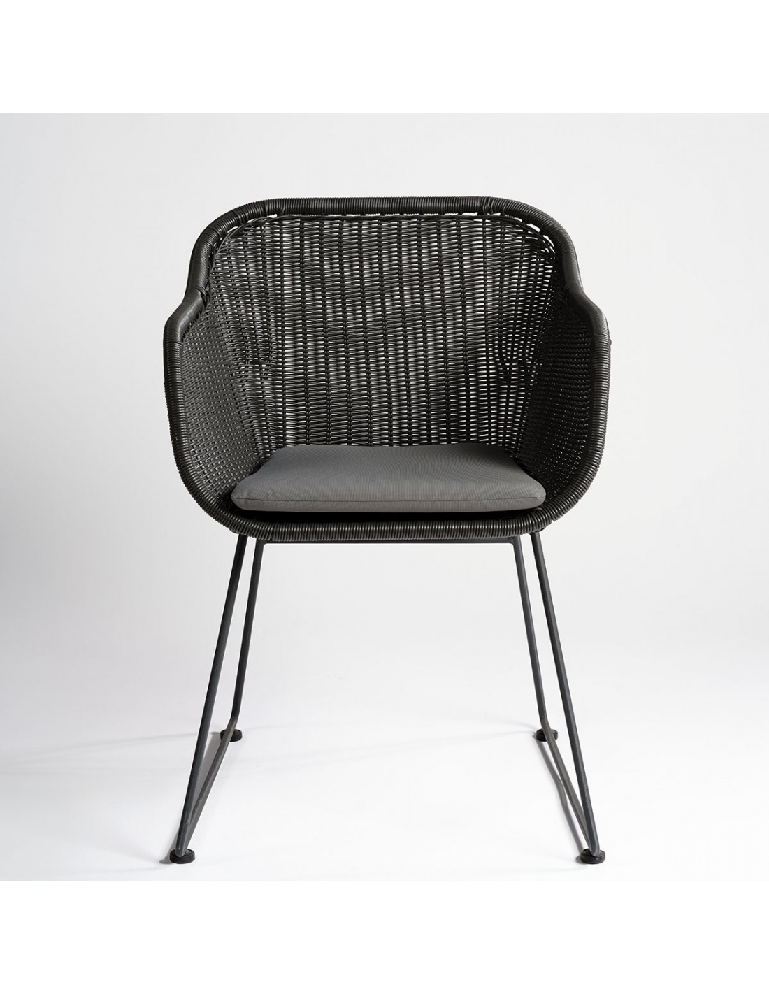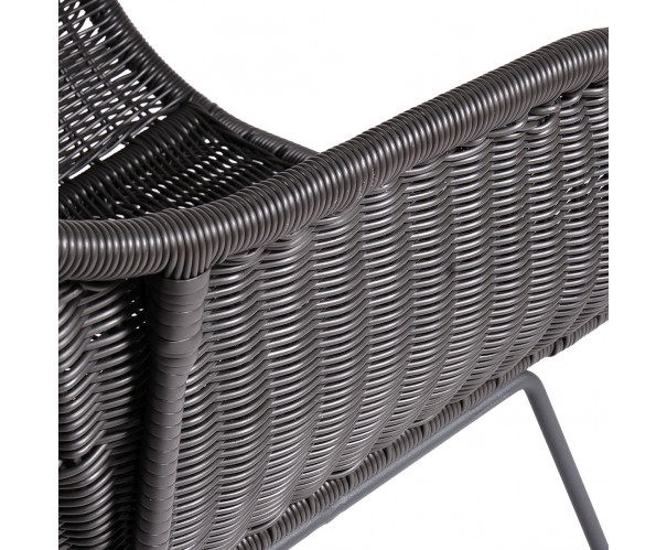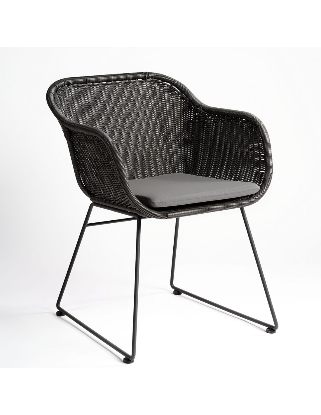 Sillón de exterior fabricado en ratán sintético de color gris. Incluye cojín en tono gris claro. Es apto para uso en exterior, jardín y camping. Posibilidad de combinarlo con la silla modelo LUCIA-G.