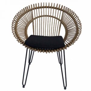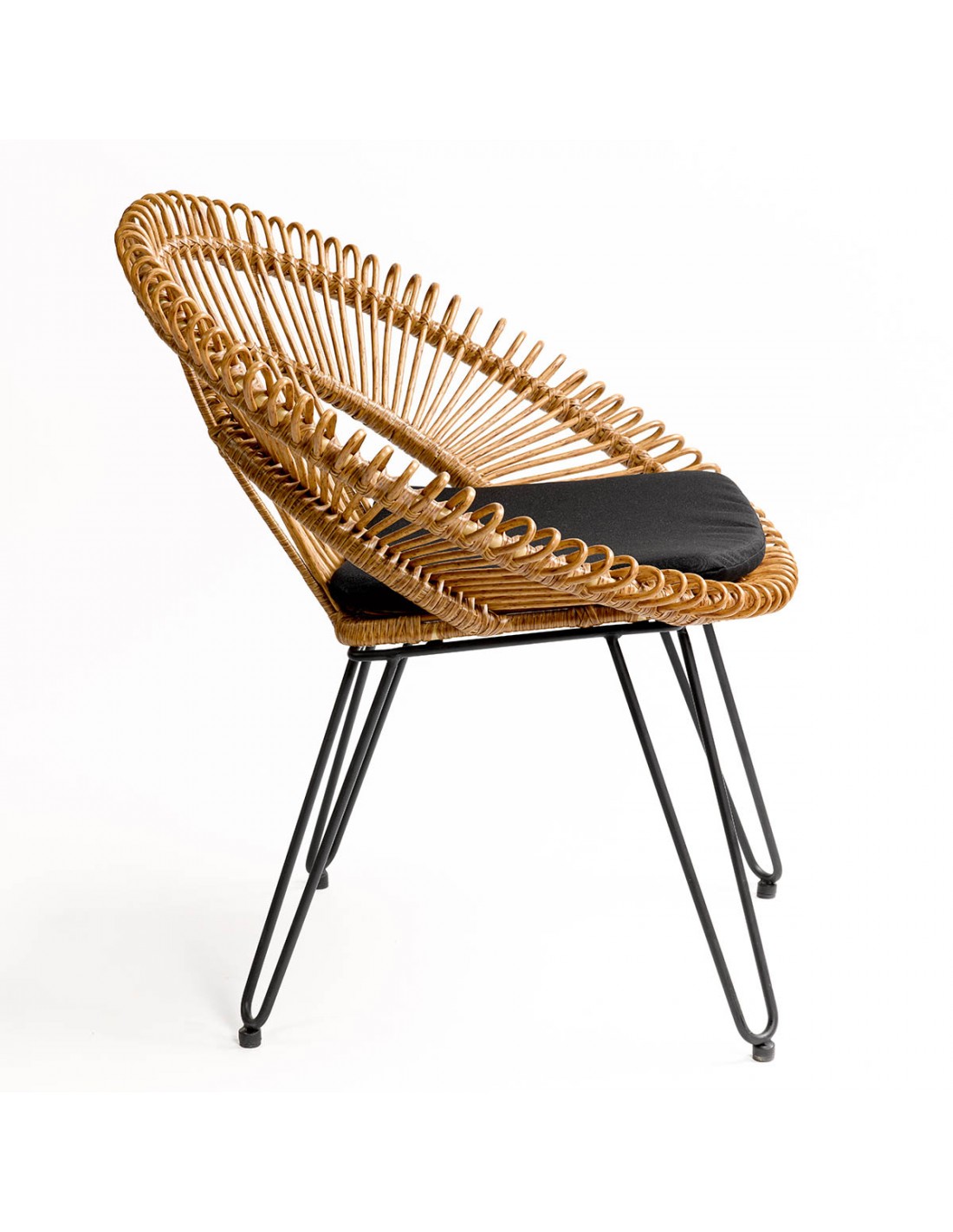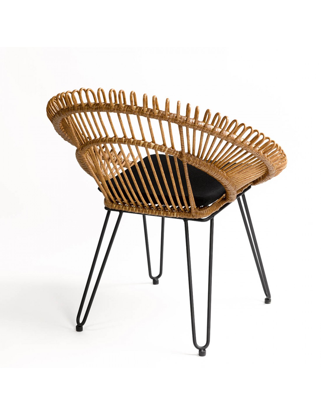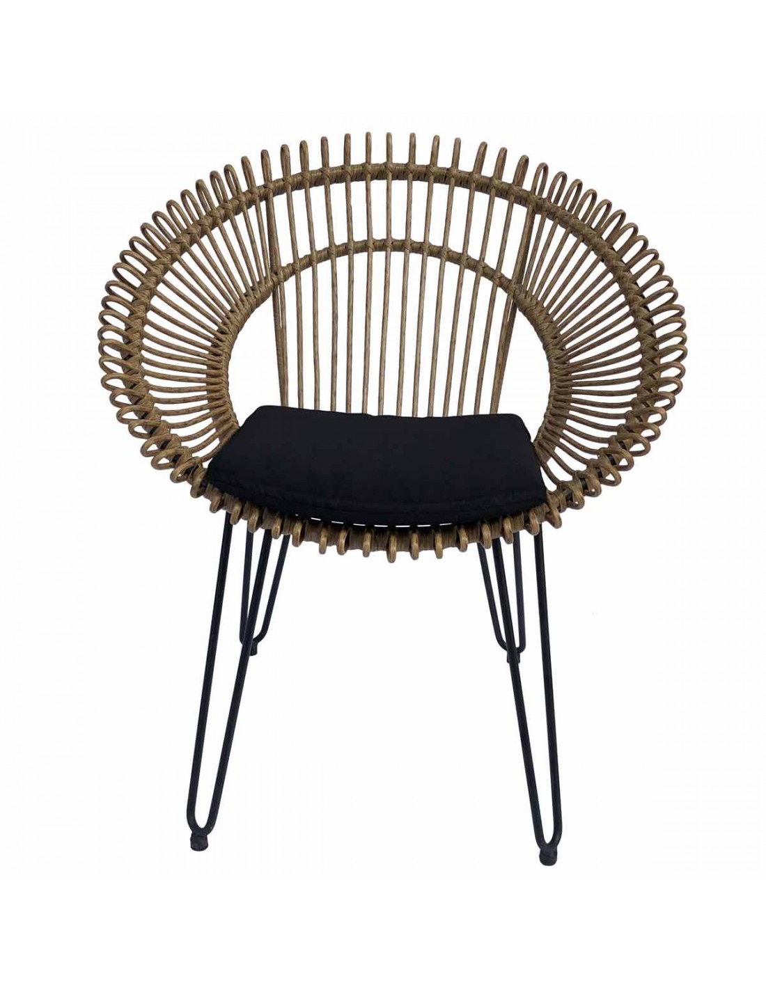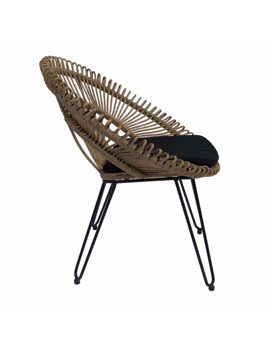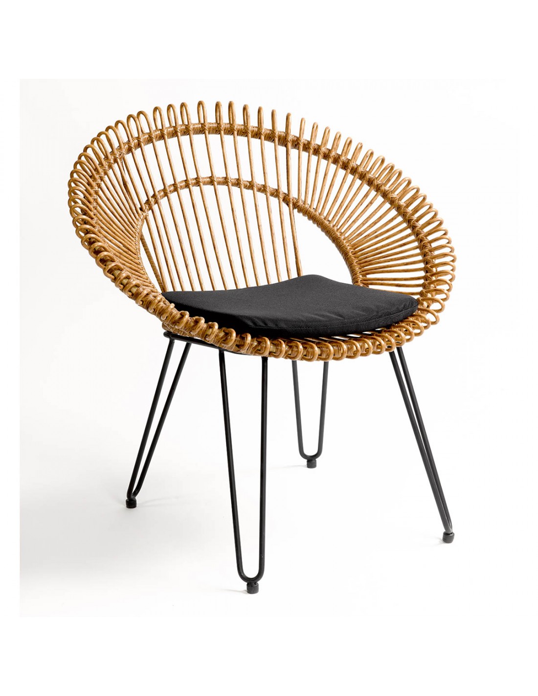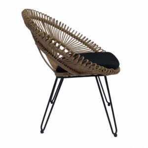 Sillón de ratán sintético para exterior con forma redondeada. Tiene un asiento y respaldo muy particular con terminaciones redondeadas. La base es de metal color negro y cuenta con un cojín incluido en color negro.