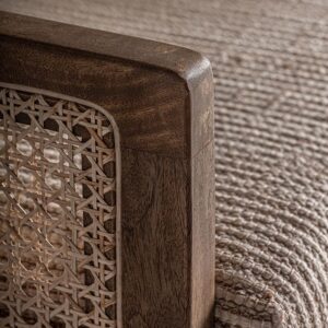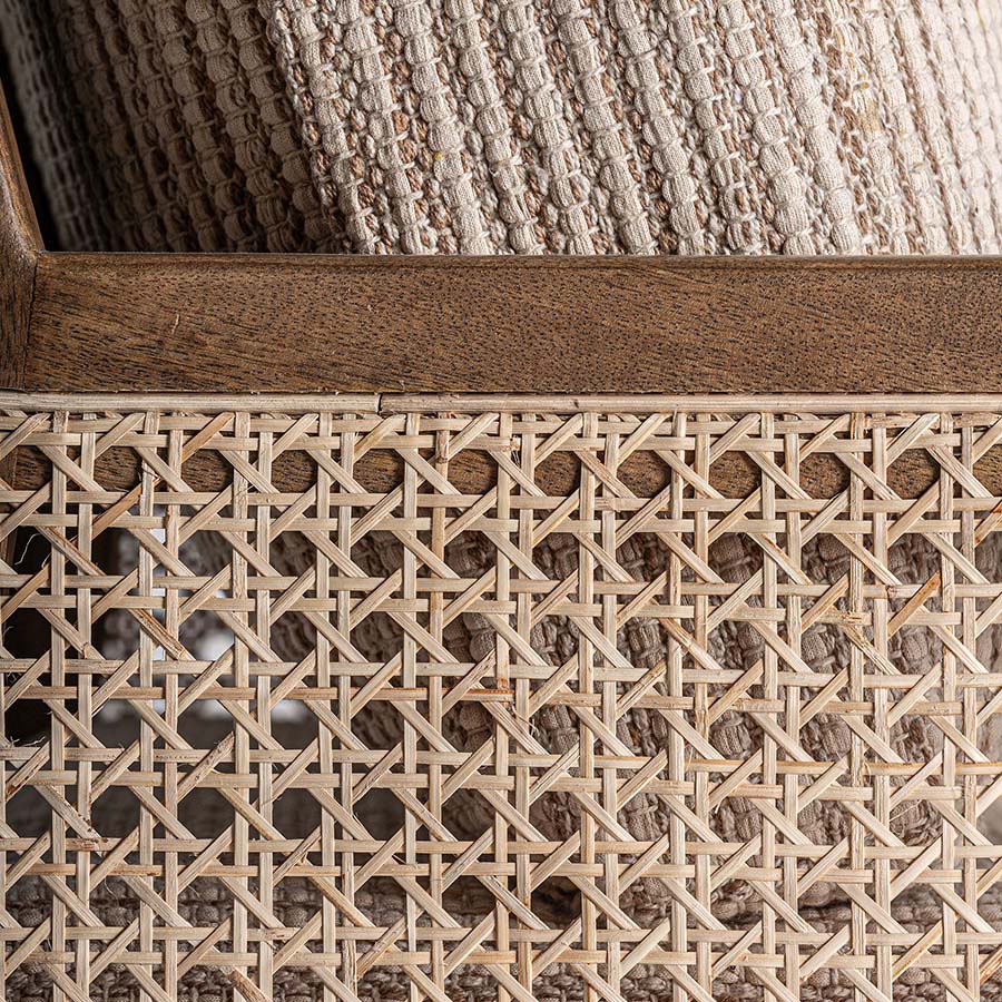Sillón romarand de estilo clásico fabricado en madera de mango en color marrón combinado con mimbre en color beige y madera dm.