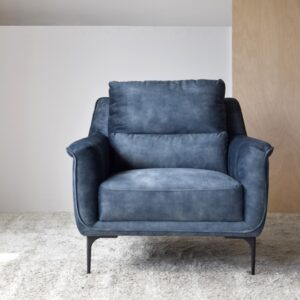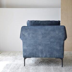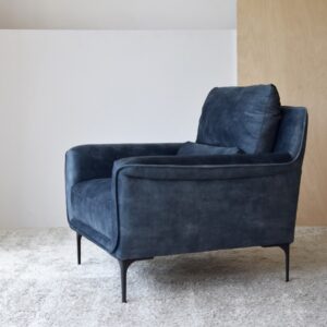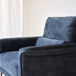 BUTACA TAPIZADA EN TERCIOPELO COLOR AZUL DESGASTADO Y PATAS METÁLICAS EN NEGROLAS FORMAS CURVAS DEL REPOSABRAZOS Y EL ACOLCHADO DEL ASIENTO Y RESPALDO CONFIRMAN LA COMODIDAD DE ESTA BUTACA Y RESALTAN UN DISEÑO CONTEMPORANEO Y EQUILIBRADO. LA TELA DEL TAPIZADO TIENE UN PATRÓN QUE COMBINA UN TONO GRIS CLARO CON UN BLANCO ROTO Y UN TACTO SUAVE Y AGRADABLE QUE INVITA A DESCANSAR.LAS PATAS METALICAS LACADAS EN NEGRO MATE ESTÁN DISEÑADAS PARA DESTACAR EL DISEÑO DE LA PIEZA SU FORMA SE VA ENSANCHANDO LEVEMENTE DESDE EL SUELO HASTA EL APOYO DE LA BUTACA CONVIERTIENDOLA EN UNA ELEMENTO LIGERO QUE DIALOGA CON CUALQUIER ESTILO.