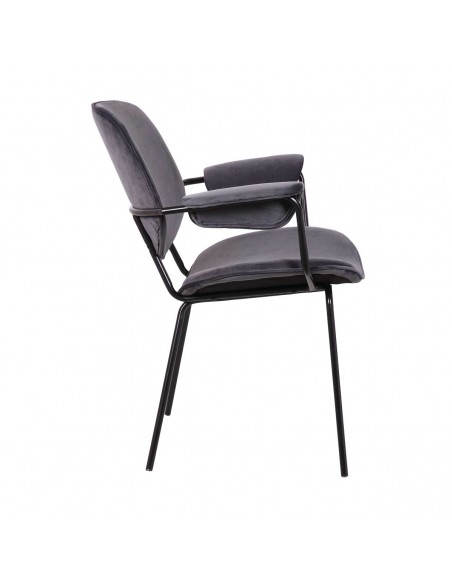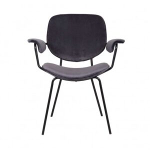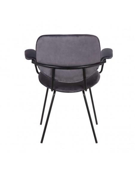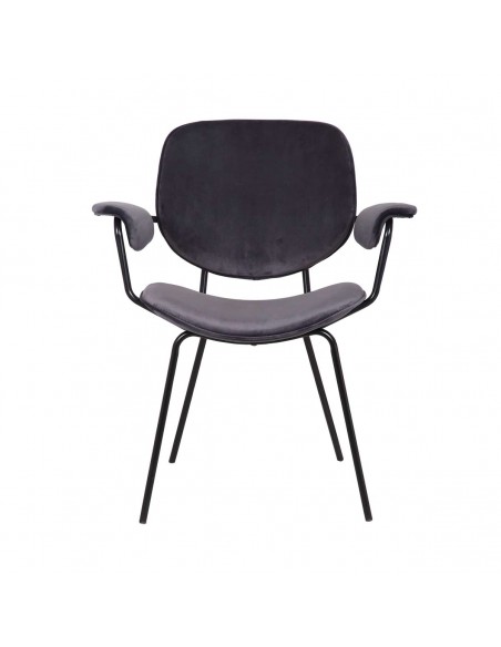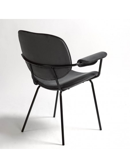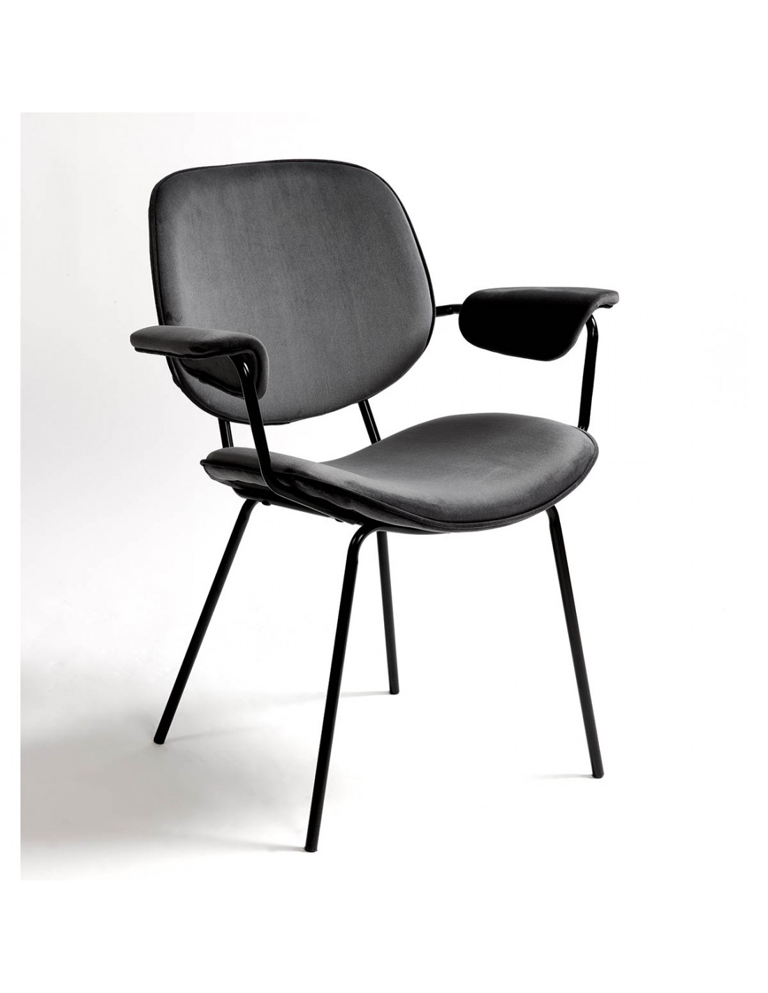 Sillón tapizado en gris oscuro con patas y estructura en metal negro.