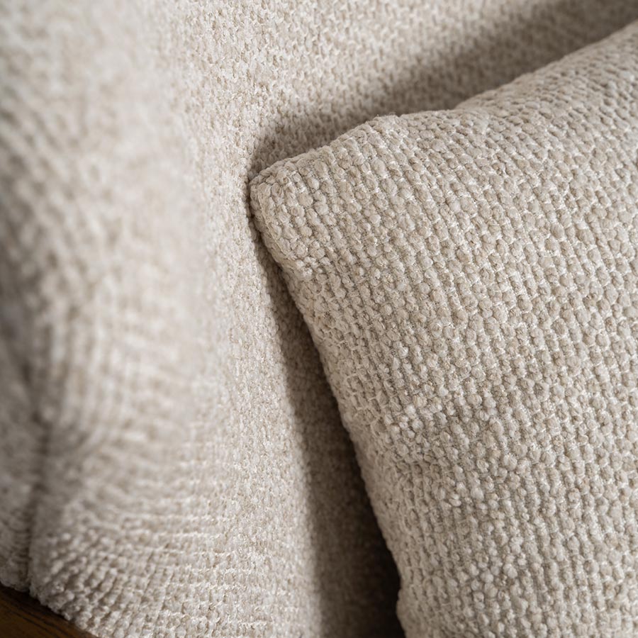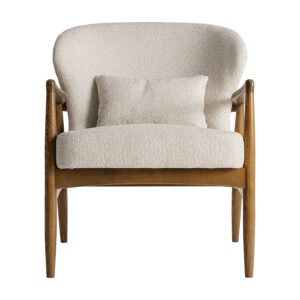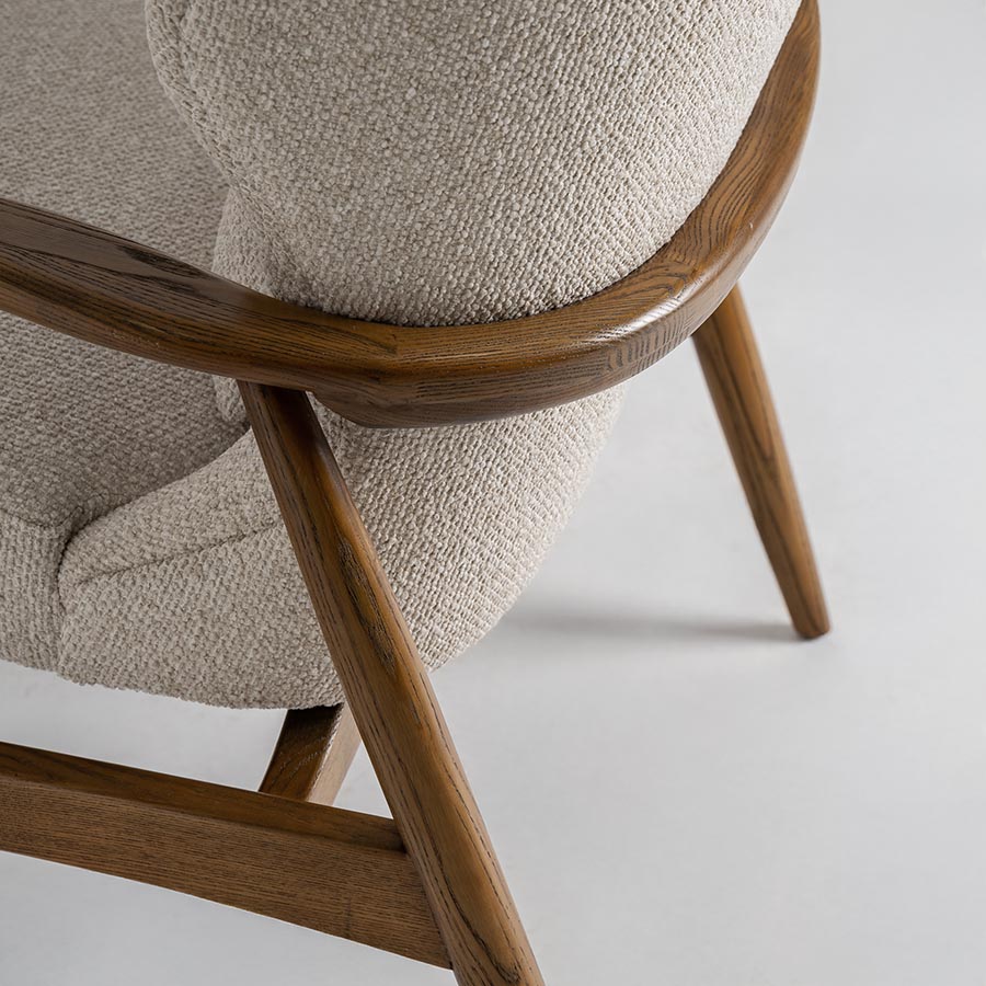 Sillón Tarres de estilo contemporáneo fabricado en poliéster en color beige combinado con madera de fresno en color marrón y espuma.