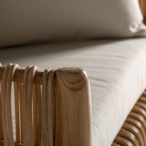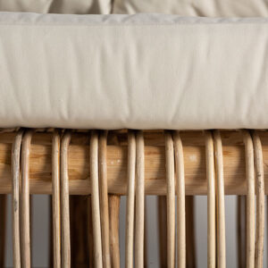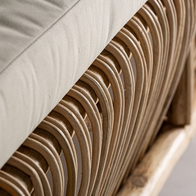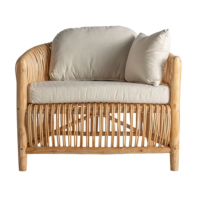 Sillón tisno de estilo contemporáneo, fabricado en ratán en color marrón, combinado con algodón. Producto desmontable, desenfundable.