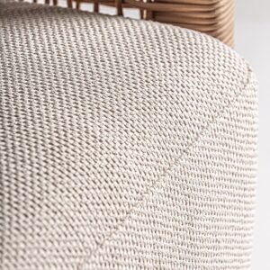 Sillón trena de estilo boho fabricado en madera de teka reciclada en color marrón con acabado natural combinado con polipropileno reciclado en color beige y espuma. Producto desmontable desenfundable.