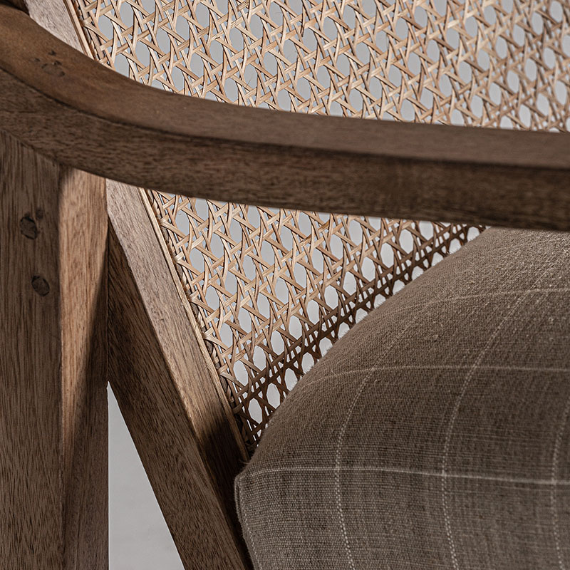 Sillón valhey de estilo colonial fabricado en madera de mango en color marrón combinado con poliéster y ratán.