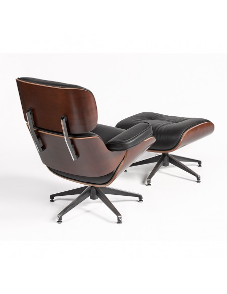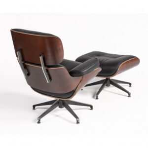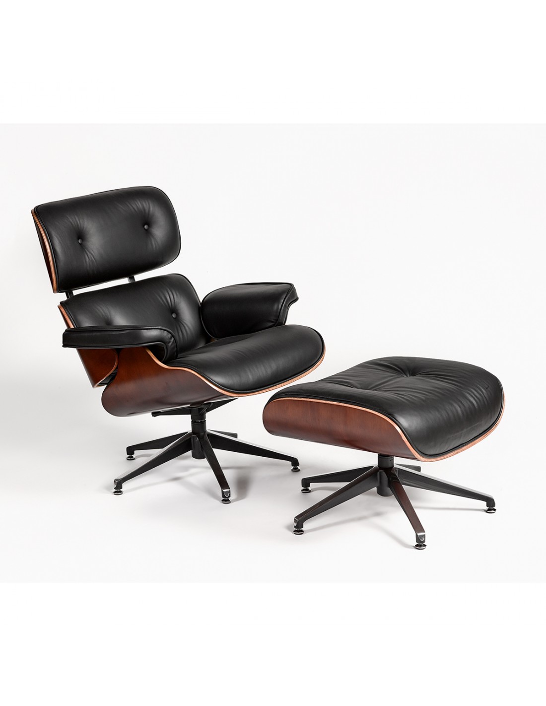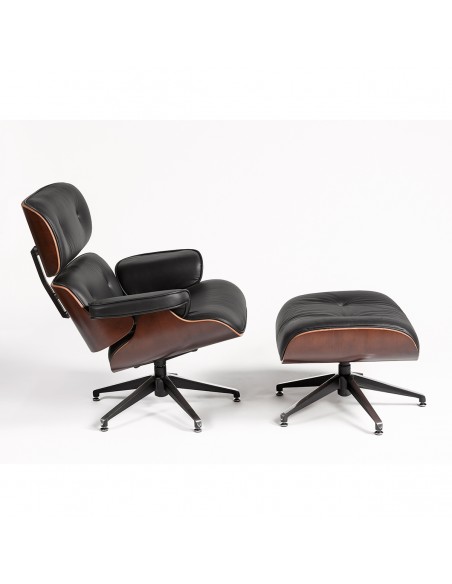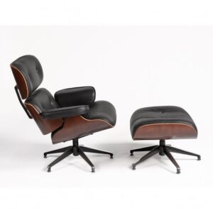 SILLÓN Y REPOSAPIES PIEL NEGRA Y MADERA