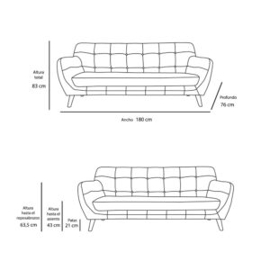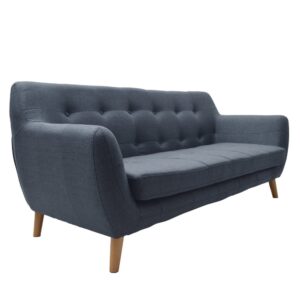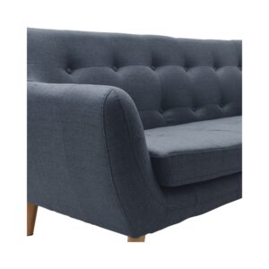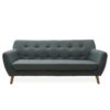 Sofá de tres plazas en color azul jeans con patas en madera color natural.