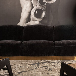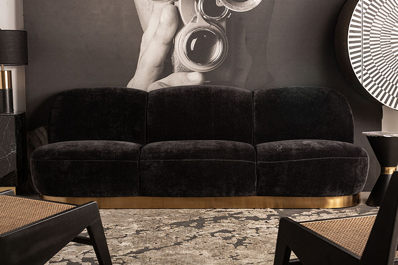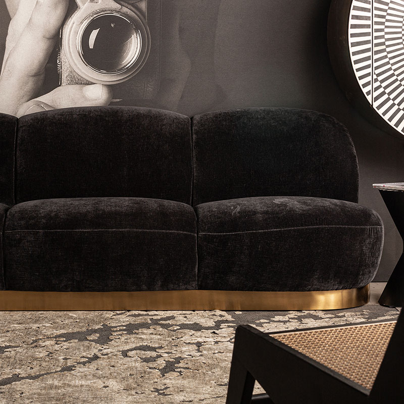 Sofá balsot en color negro oro de estilo art deco. Fabricado en madera de pino combinado con terciopelo y acero.