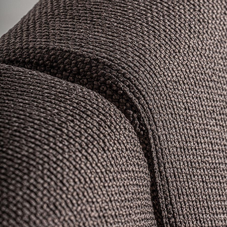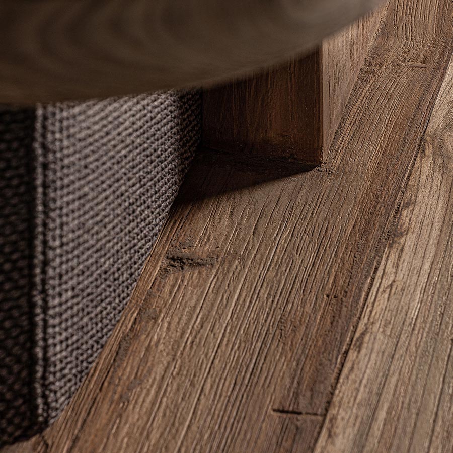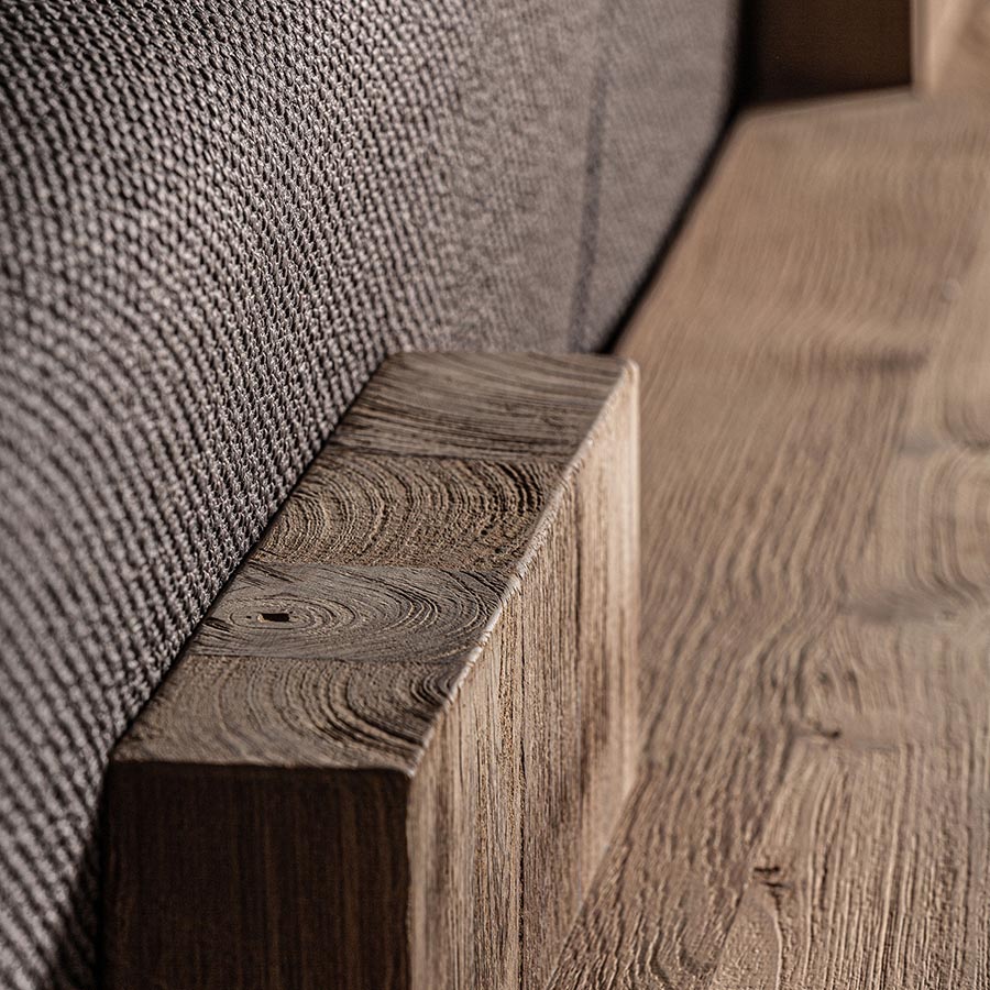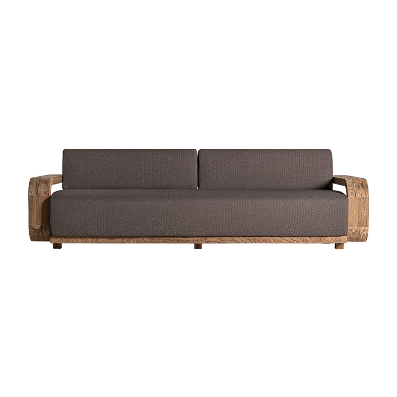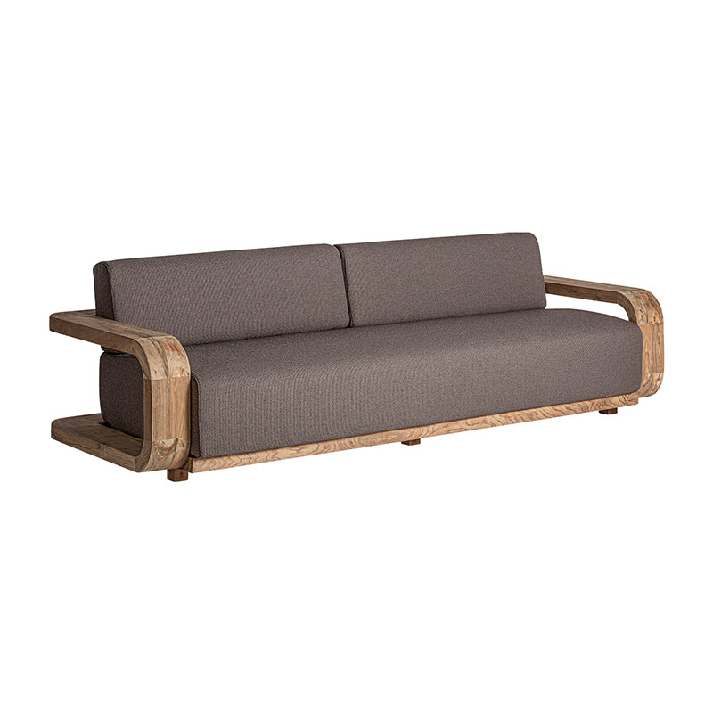 Sofá corba de estilo colonial fabricado en madera de teka reciclada en color marrón con acabado natural combinado con polipropileno reciclado y espuma. Producto desmontable desenfundable.
