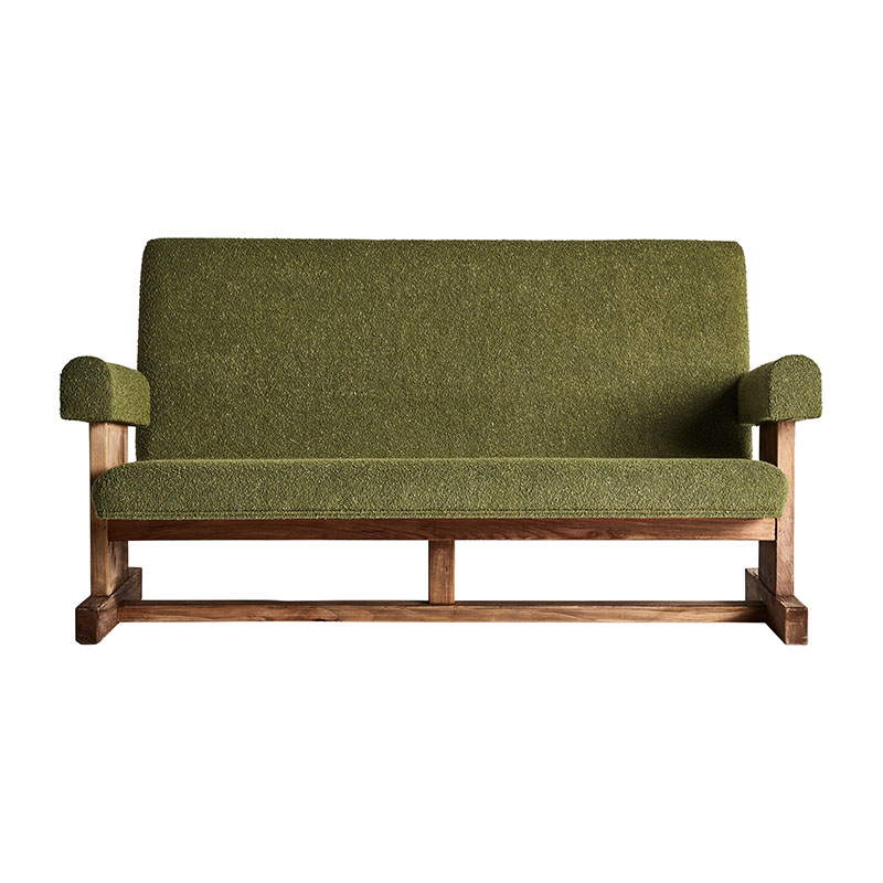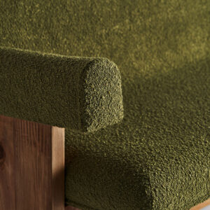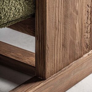 Sofá Creusot de estilo colonial fabricado en madera de pino reciclado en color marrón combinado con poliéster en color verde.