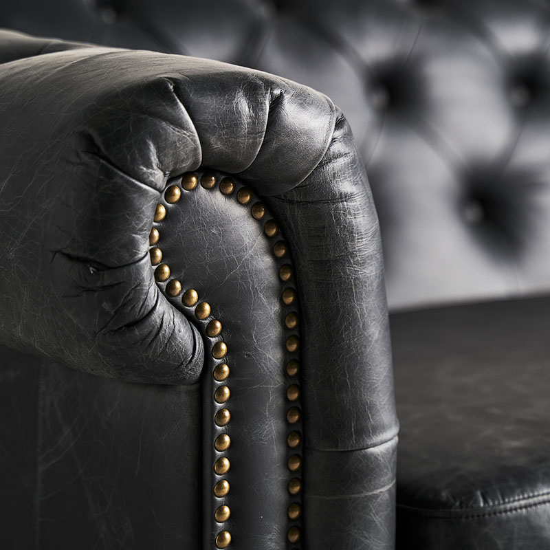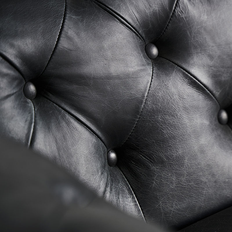Sofá chester eklo de estilo vintage, fabricado en madera abedul en color negro, combinado con piel y espuma. Producto desmontable.